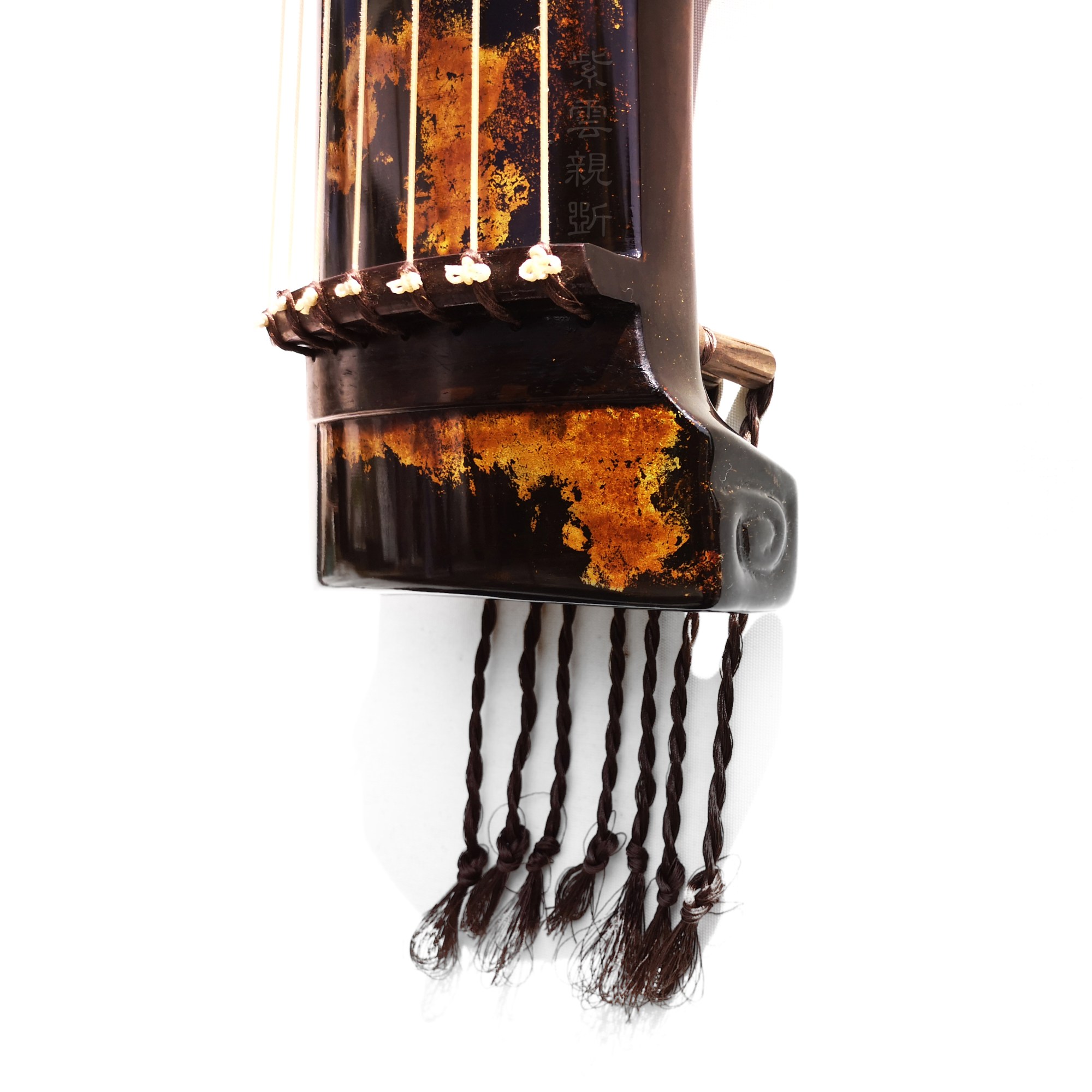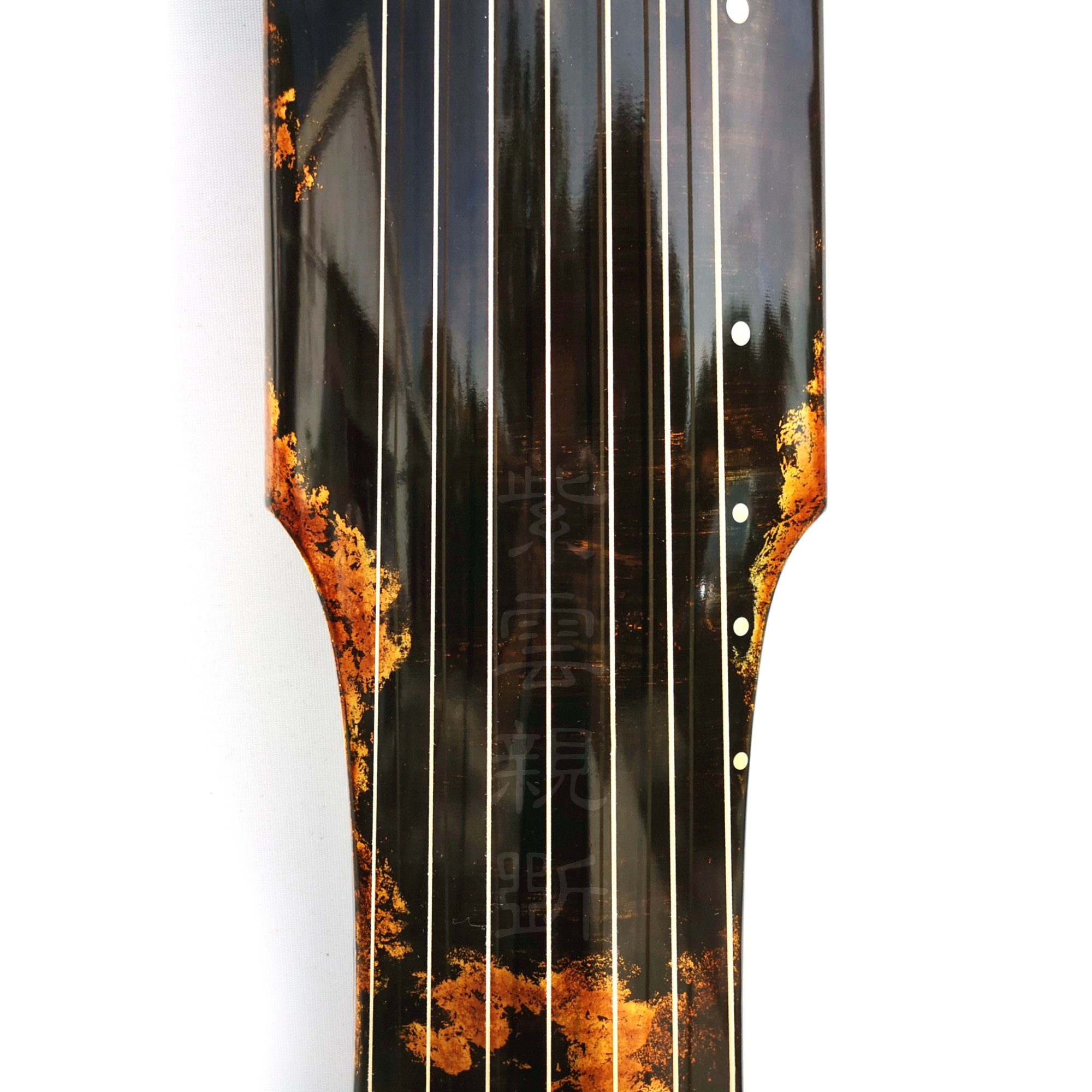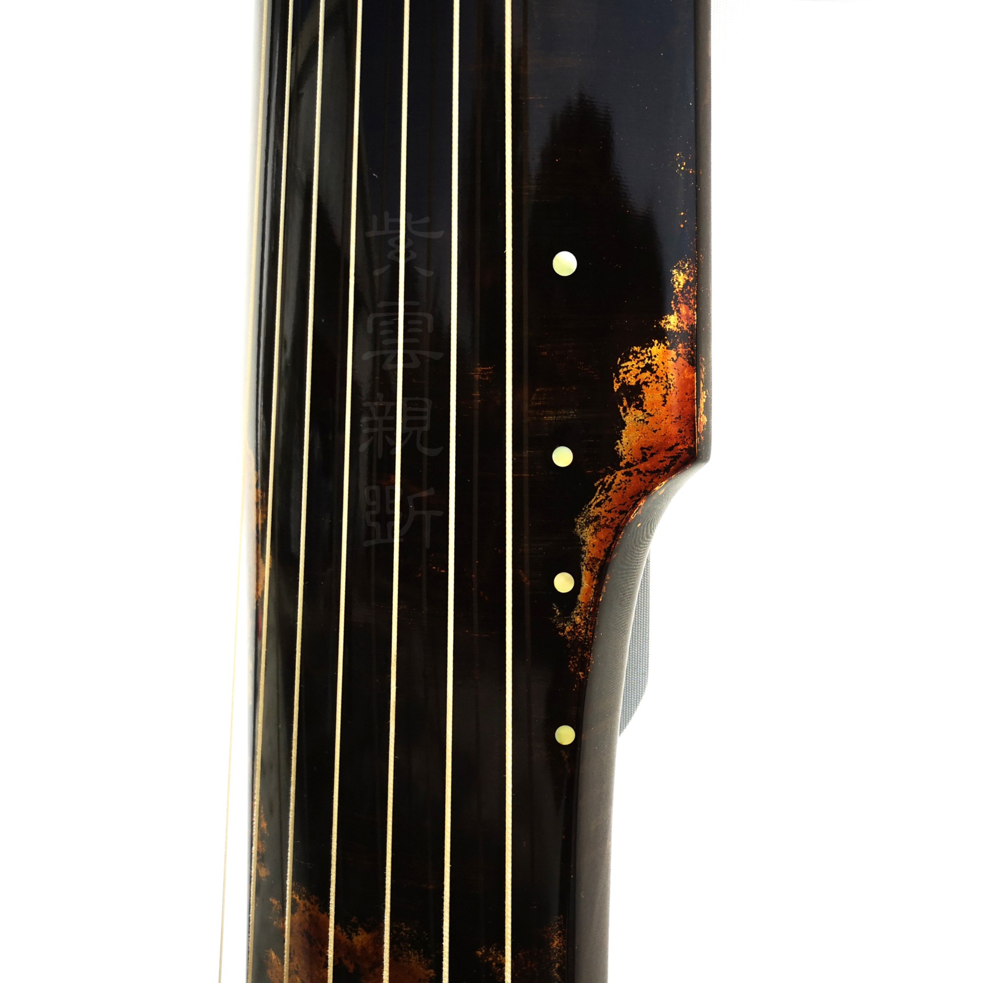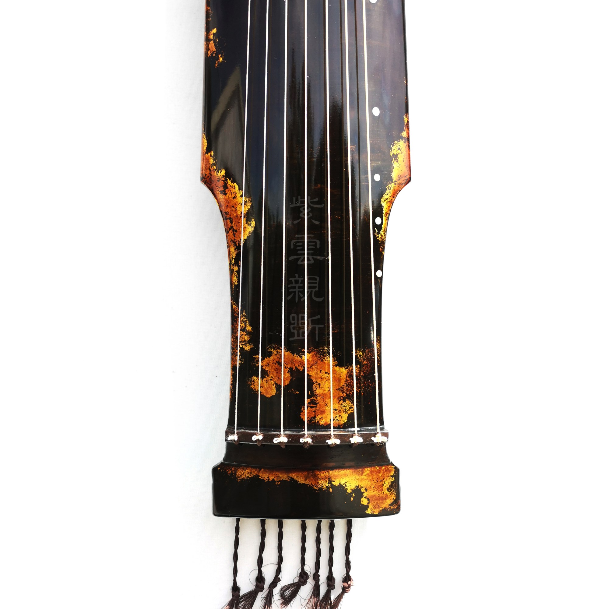 此琴目前由林棟勝會長收藏,於2020年春成琴,歷時兩年半。大鵬琴款,杉木面板,梓木底板,內腔經特殊塗層處理,腔內局部有魚鱗紋雕工,冠角化繁為簡只留龍齦,蚌貝鑲徽。素髹琴面以斑駁金箔點綴,暗暗有縱橫斑駁機理略顯倉古之味,琴底局部有紅底八寶灰分佈,肩區刻有銘文“無我”金字。賦予大體印象為“莫使金樽空對月”。