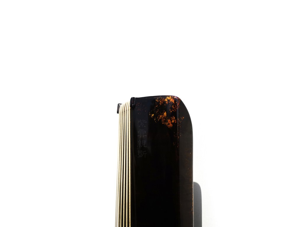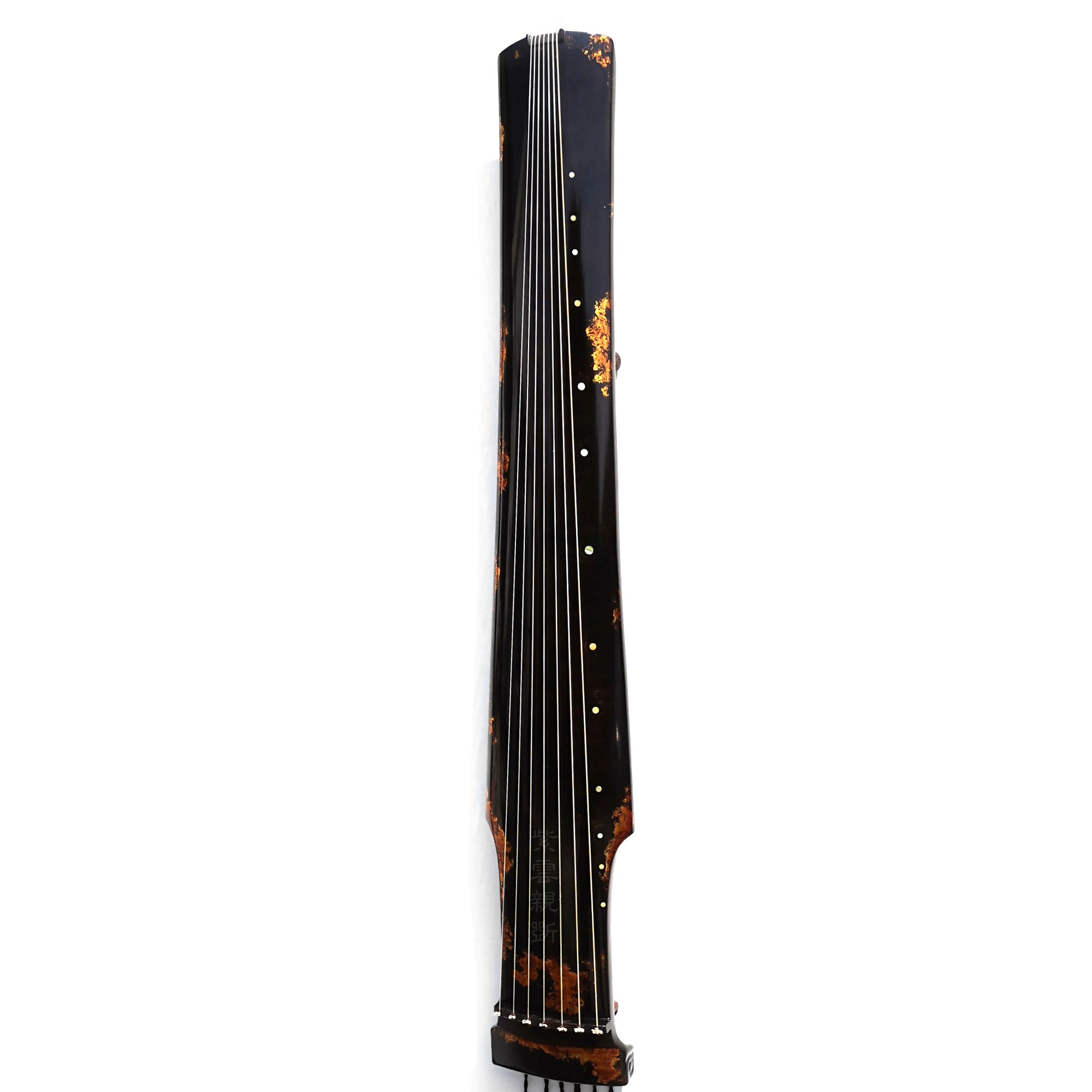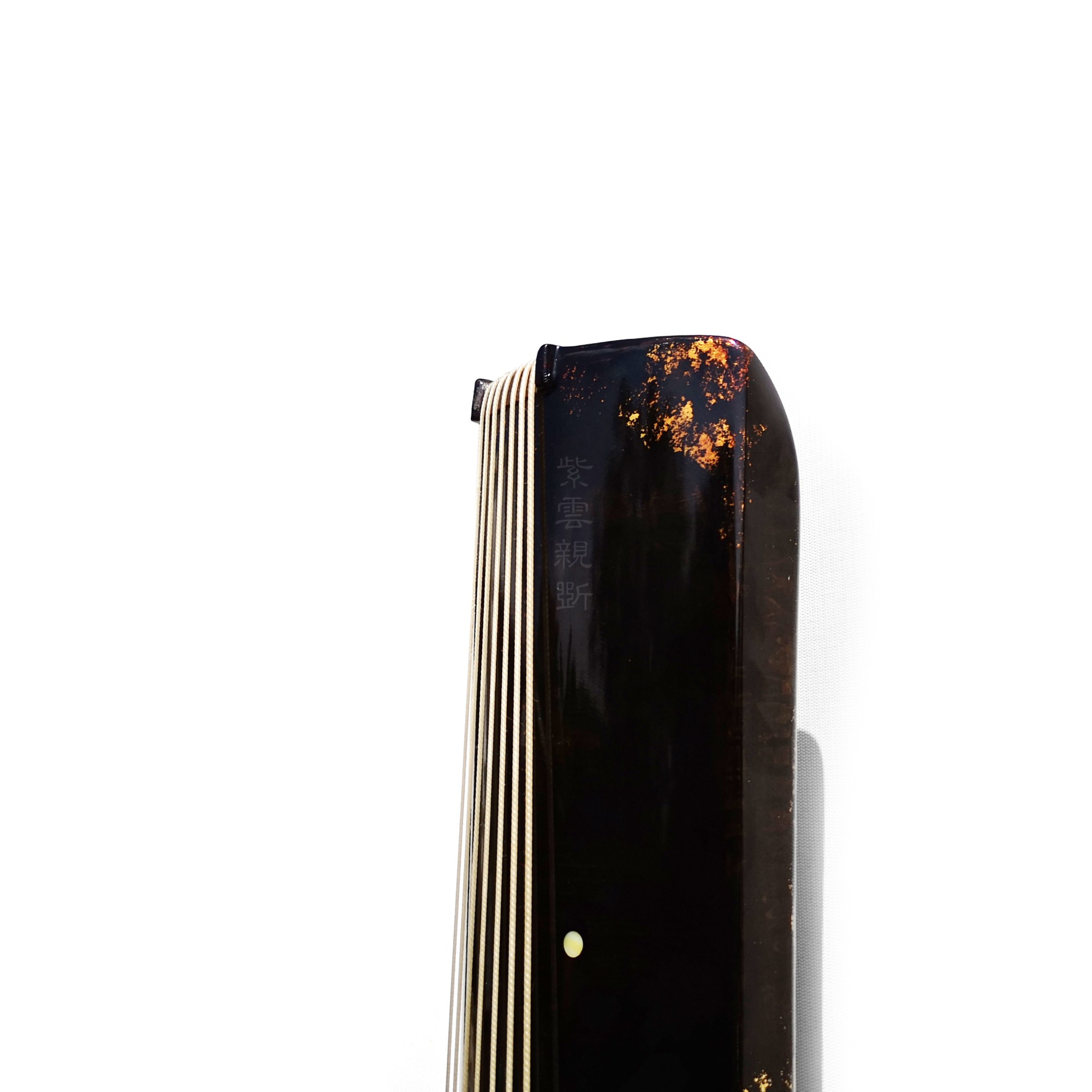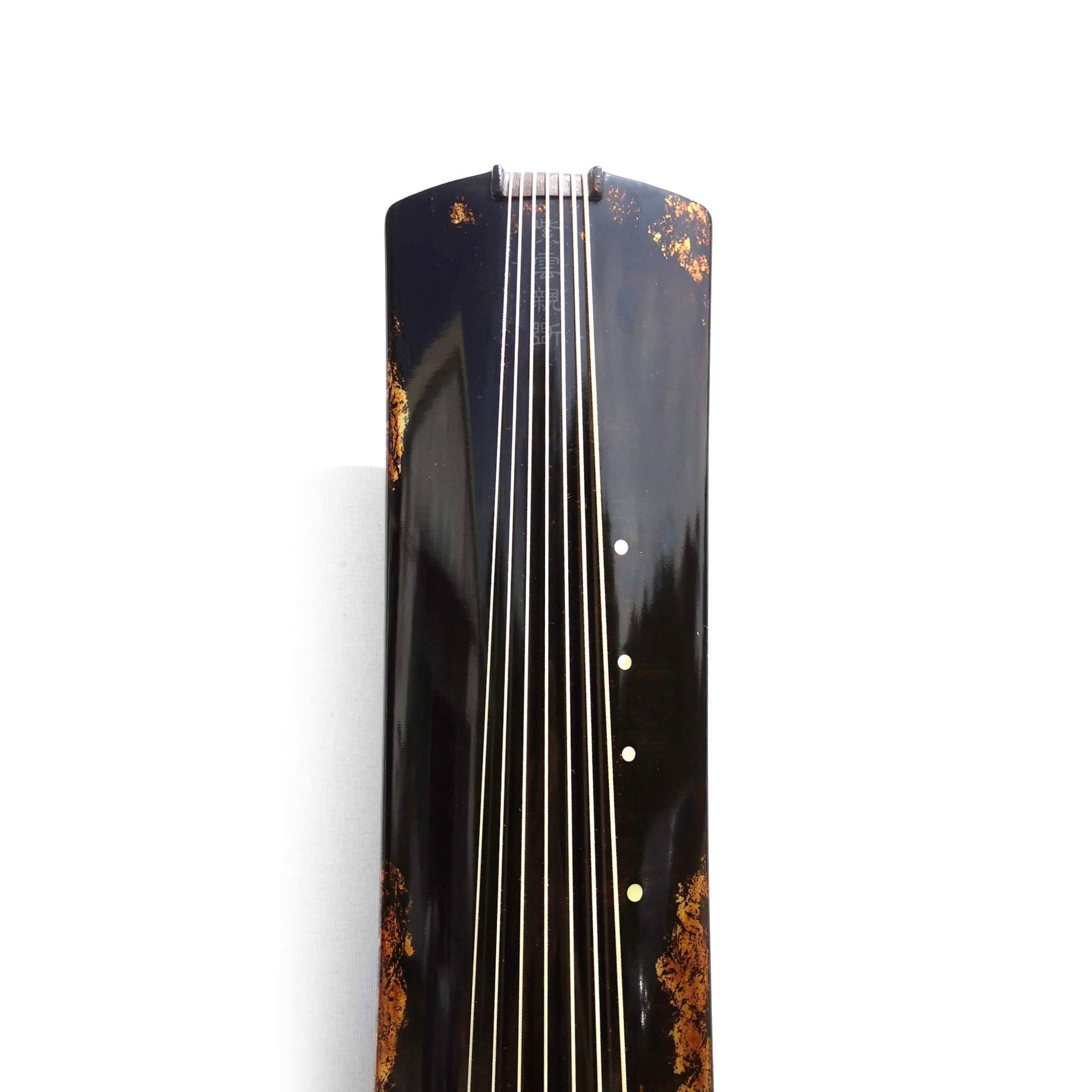 此琴目前由林棟勝會長收藏,於2020年春成琴,歷時兩年半。大鵬琴款,杉木面板,梓木底板,內腔經特殊塗層處理,腔內局部有魚鱗紋雕工,冠角化繁為簡只留龍齦,蚌貝鑲徽。素髹琴面以斑駁金箔點綴,暗暗有縱橫斑駁機理略顯倉古之味,琴底局部有紅底八寶灰分佈,肩區刻有銘文“無我”金字。賦予大體印象為“莫使金樽空對月”。