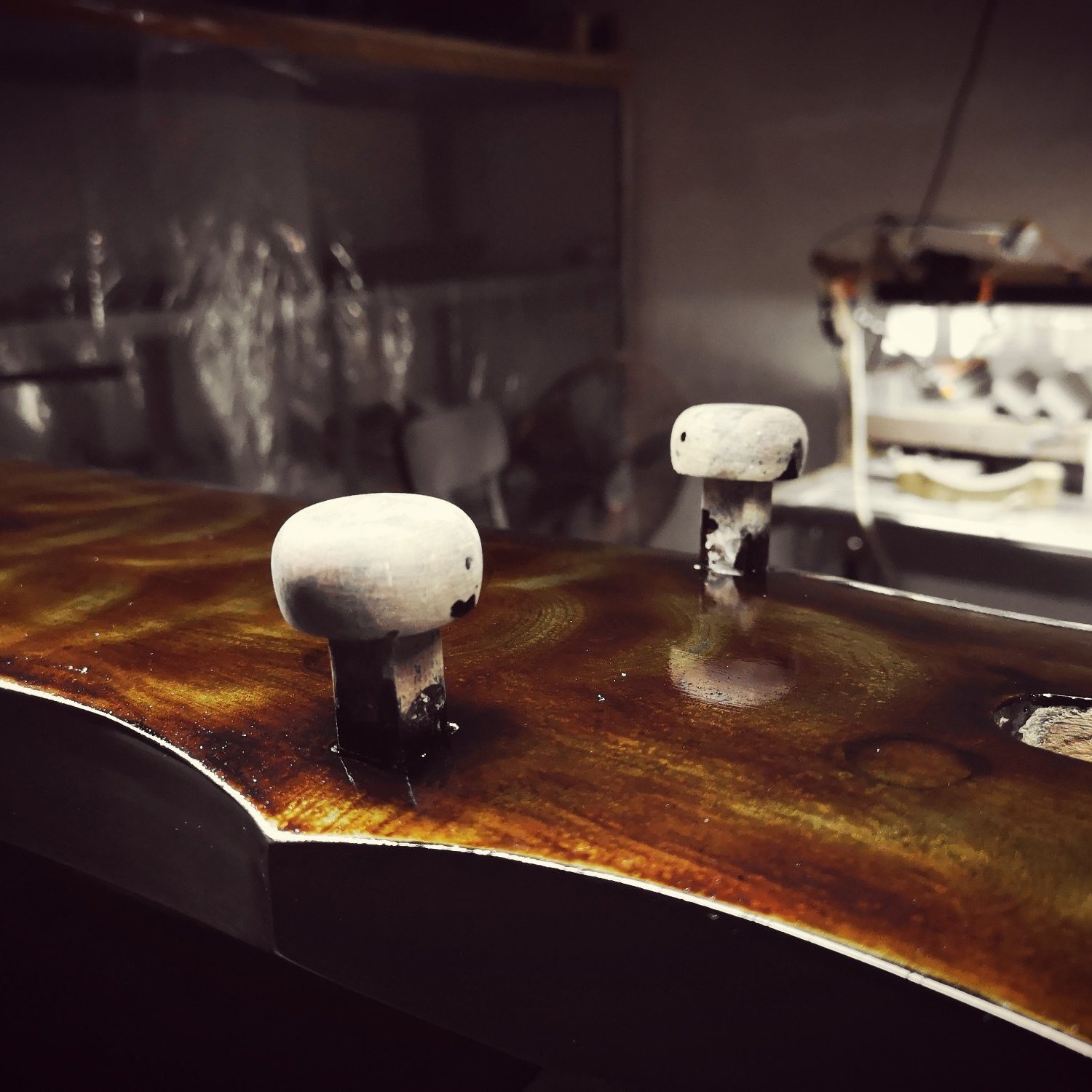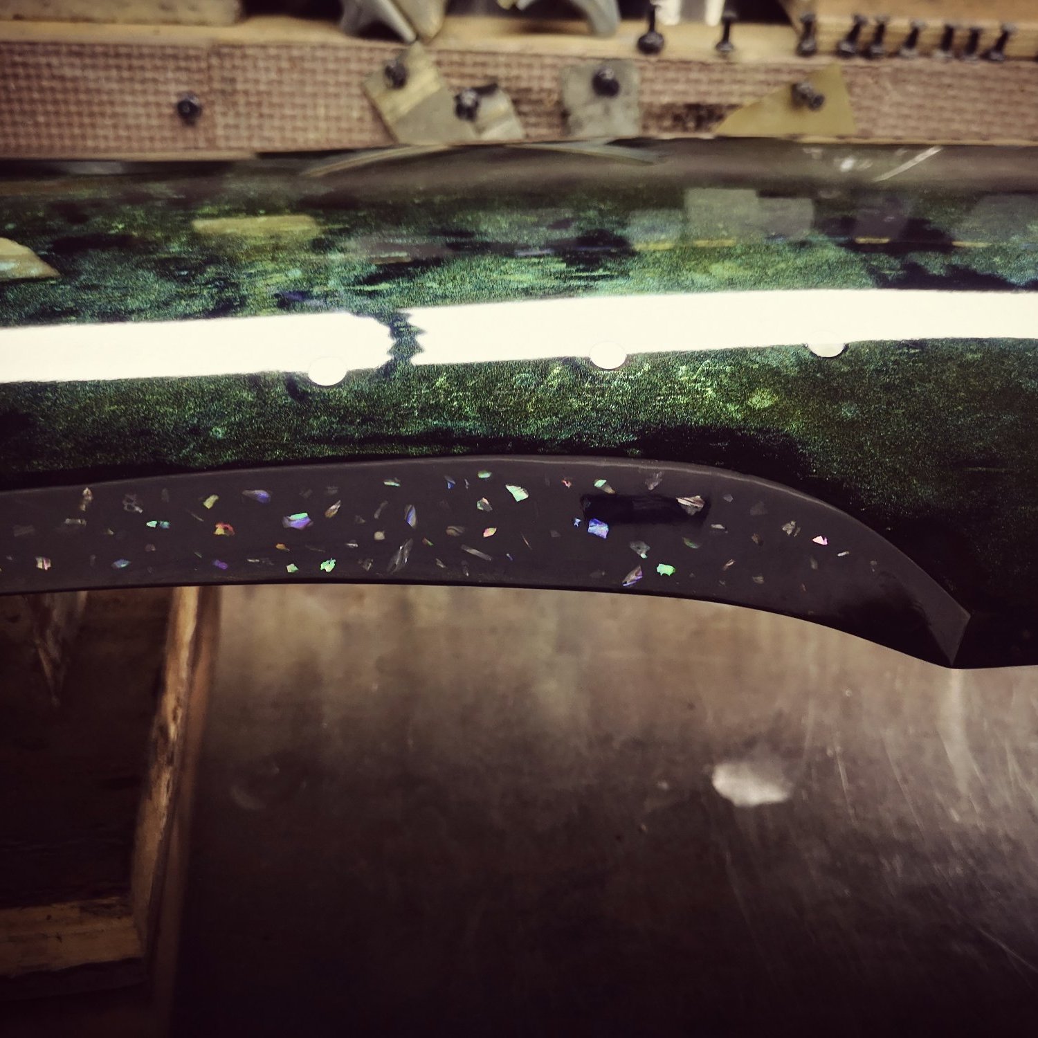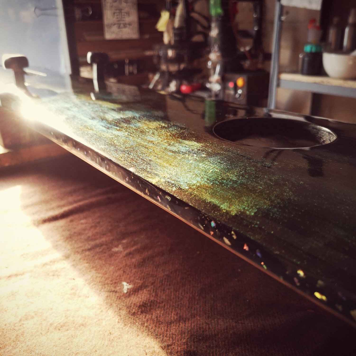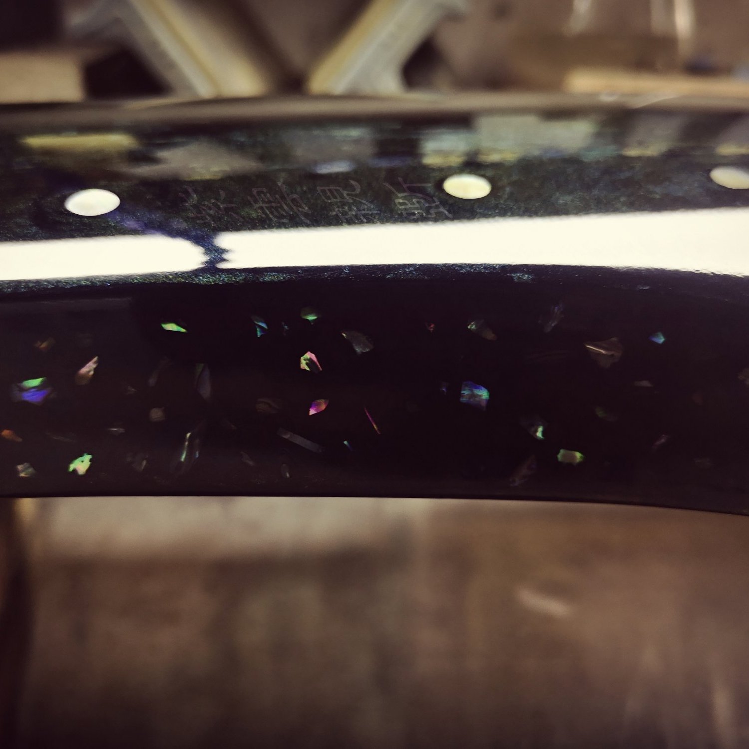 {桐玥}琴面選用桐木琴低梓木,另一張則杉木琴面梓木琴低,音色各有特色,。而兩者皆以獨創星河紋鏡面漆製作,因此閃爍層次,極盡奢華。