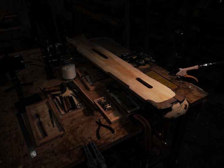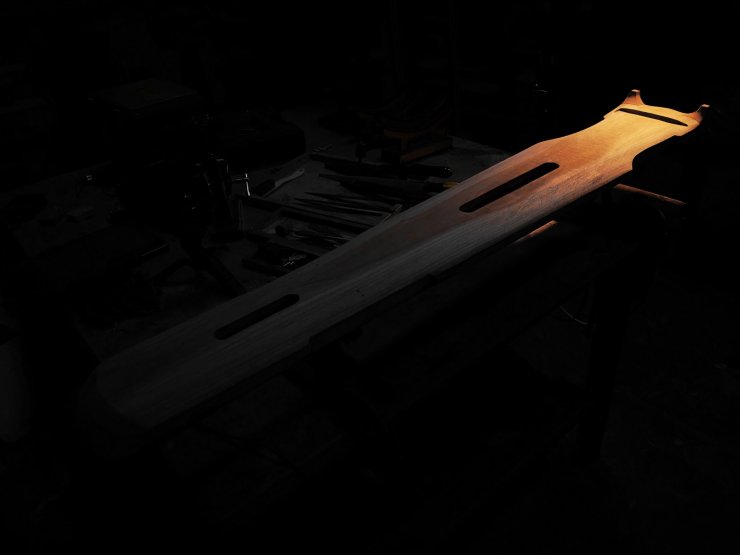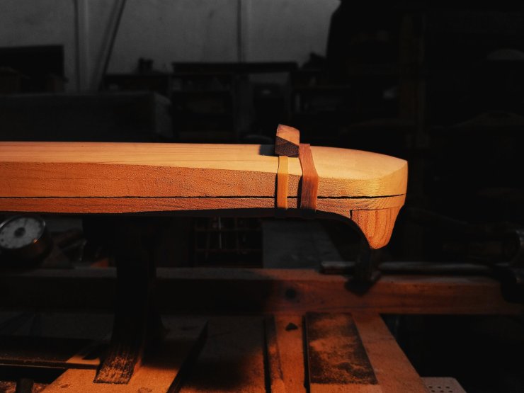 琴胚經過一段時間陳化後開始趨向穩定且乾透輕盈。繼而進行進一步的銼修外形並且糾正扭曲所造成的誤差,準備開始階段性細修各部分觀感細節,微調整體曲面流線的順暢度。