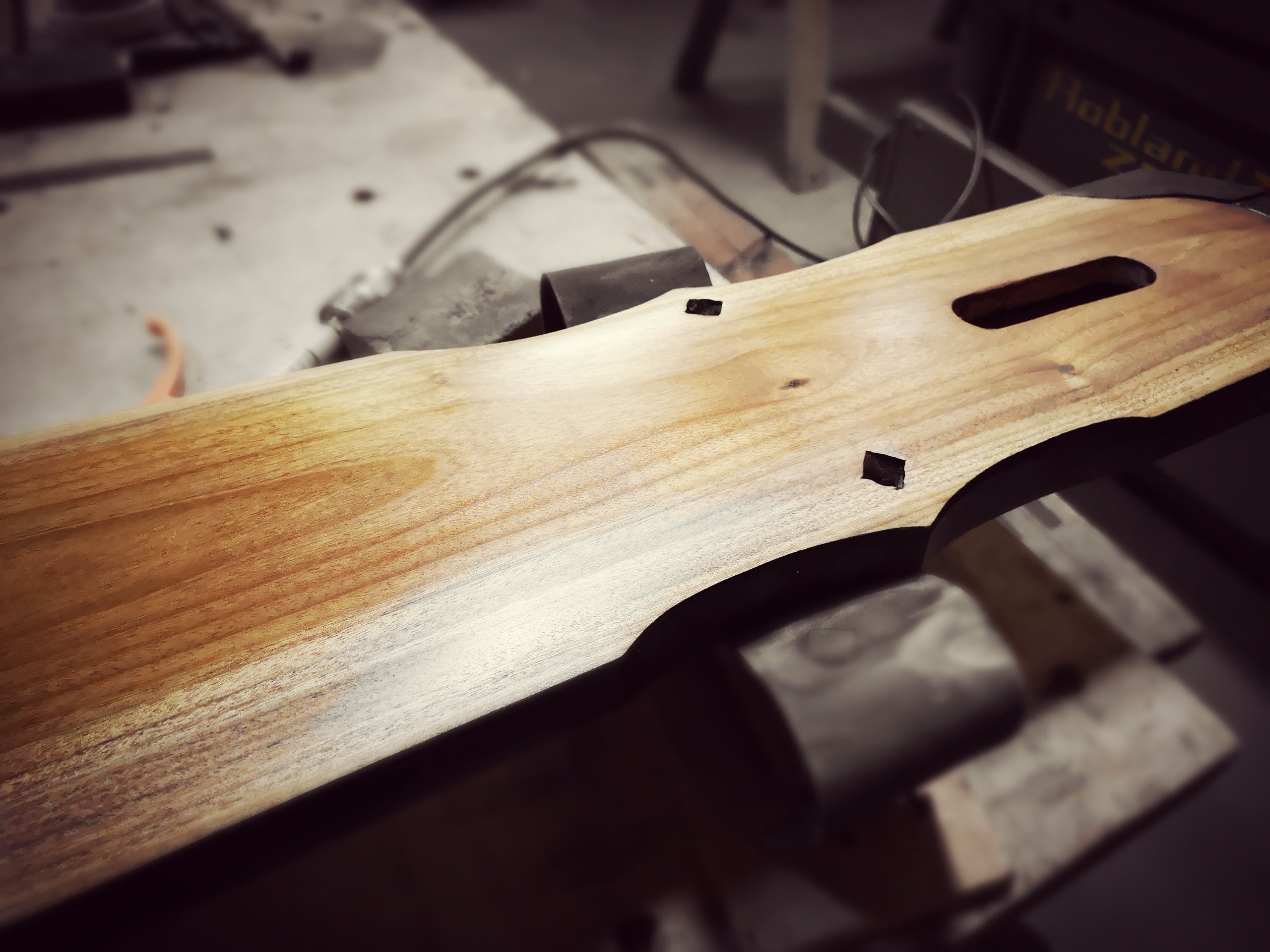 “擭軫”粘合牢固,需要幾天時間,在這段時間裏面,我會給琴的邊牆進行修補打磨,還有就是把時間安排給兩張蕉葉做底面漆,最後就是給我的枯木琴與幾張膝琴進行打磨灰胎。