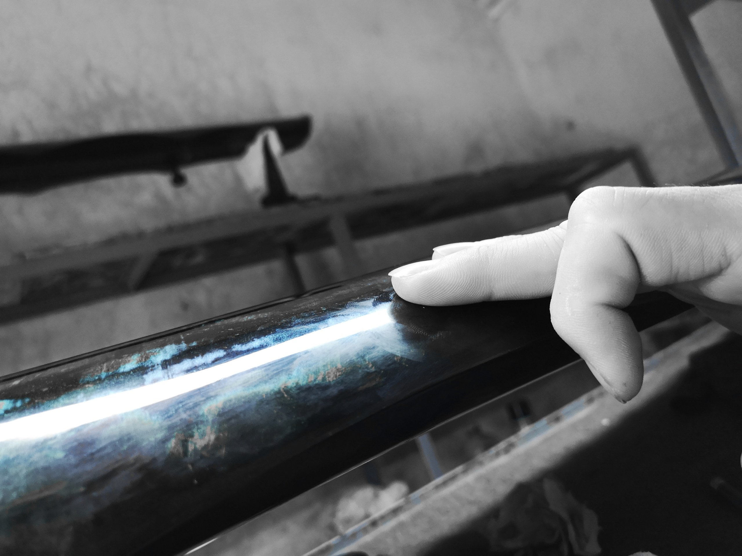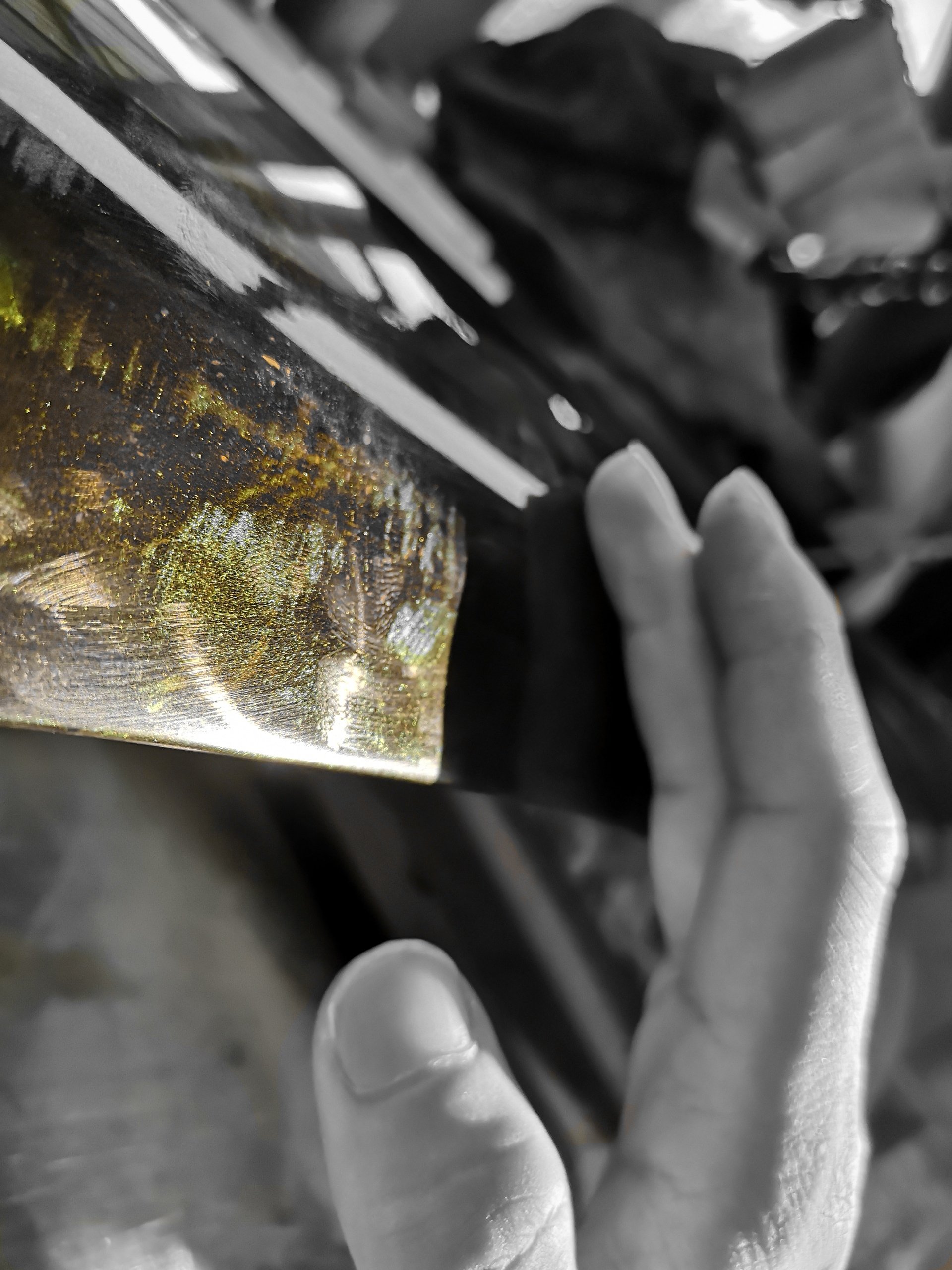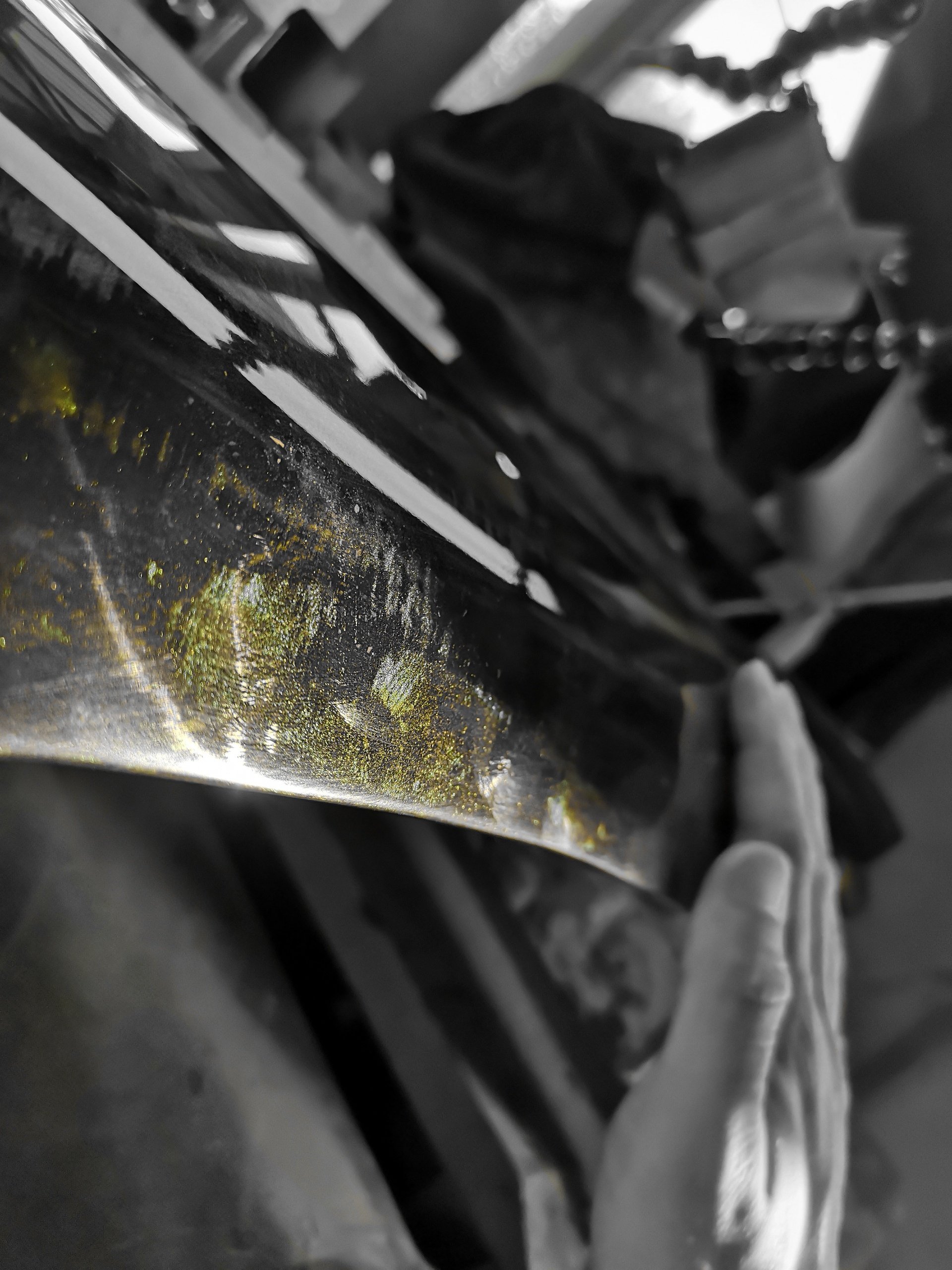 從啞光面用徒手塗抹花生油糯米粉,摩擦到變成玻璃面,其實非常耗費時間,也很枯燥。