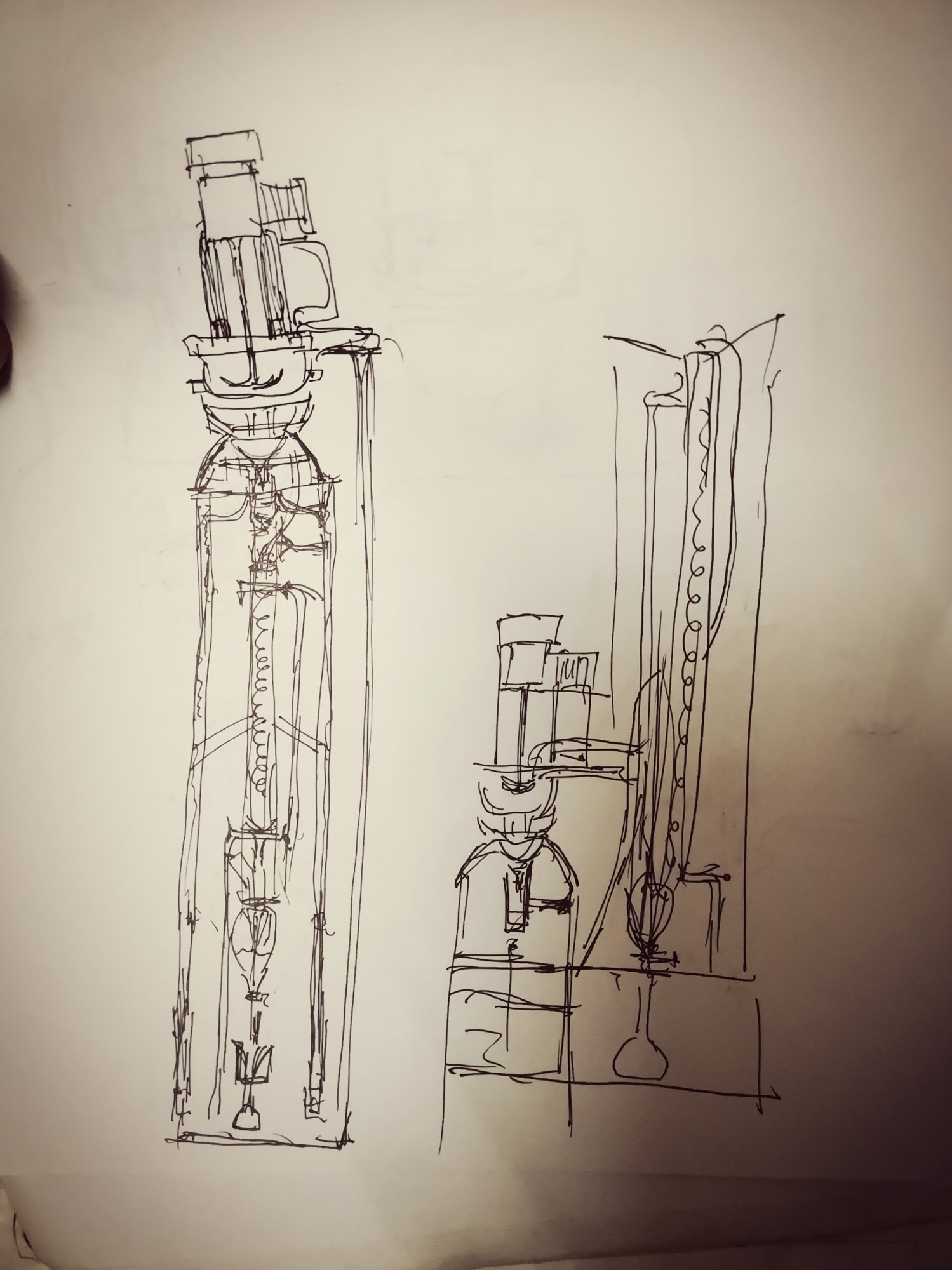 早期設計草圖是兩款,第一款實際測量機身太高且兼顧到實用性,最後放棄。至於右邊的,雖然是笨重,但方便更替零件以及維護。