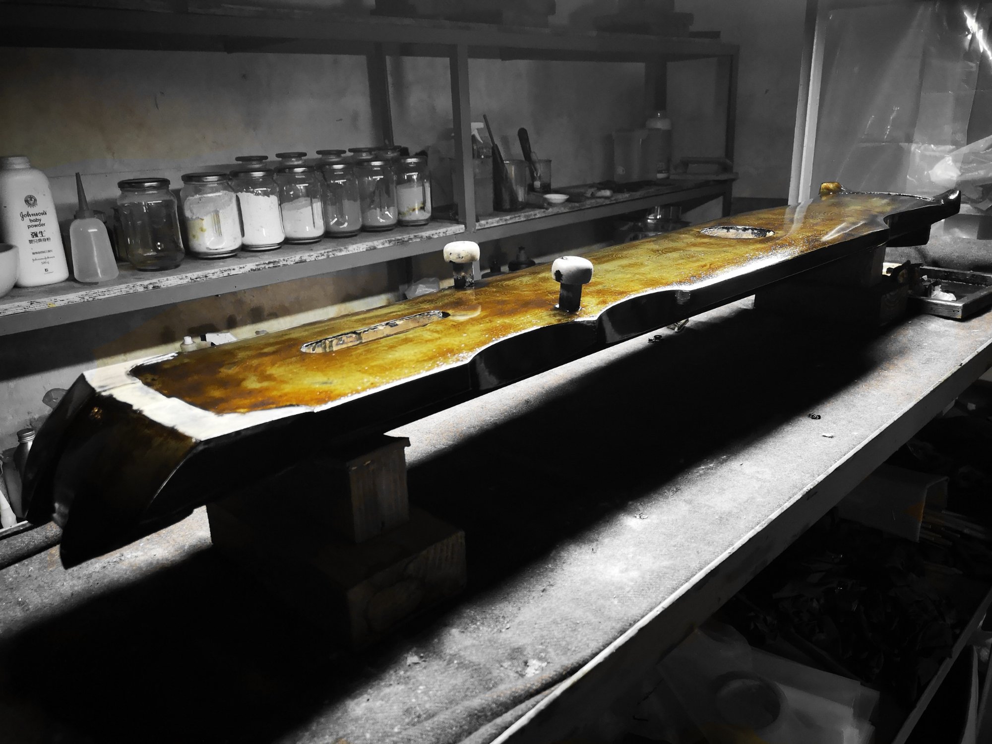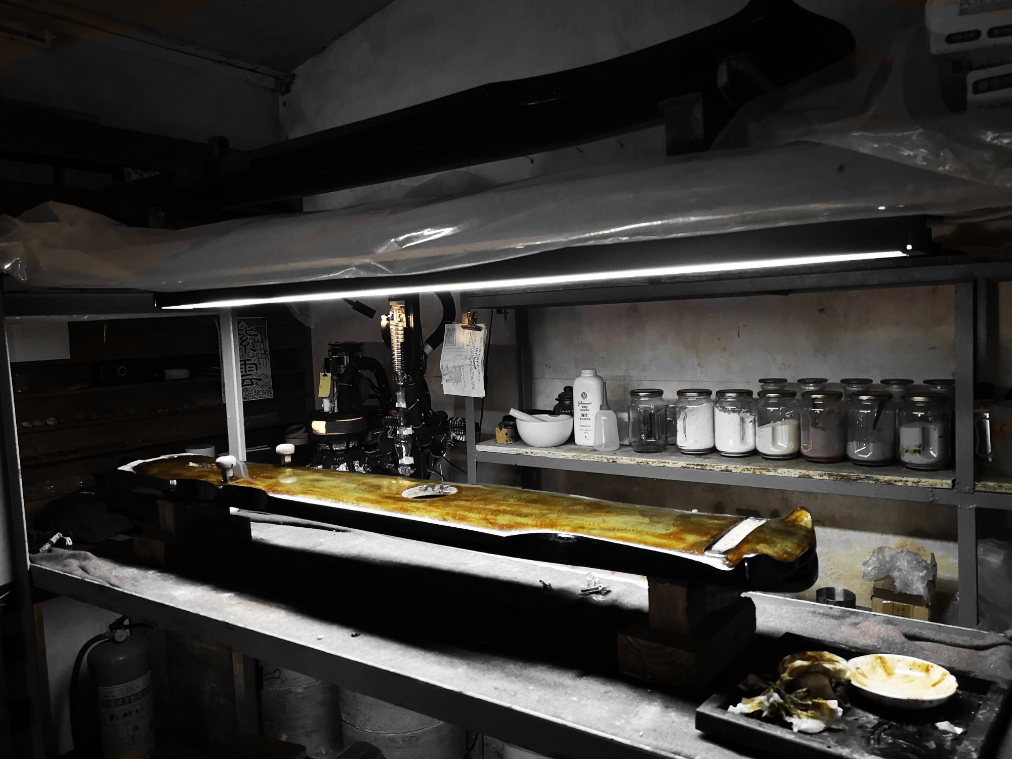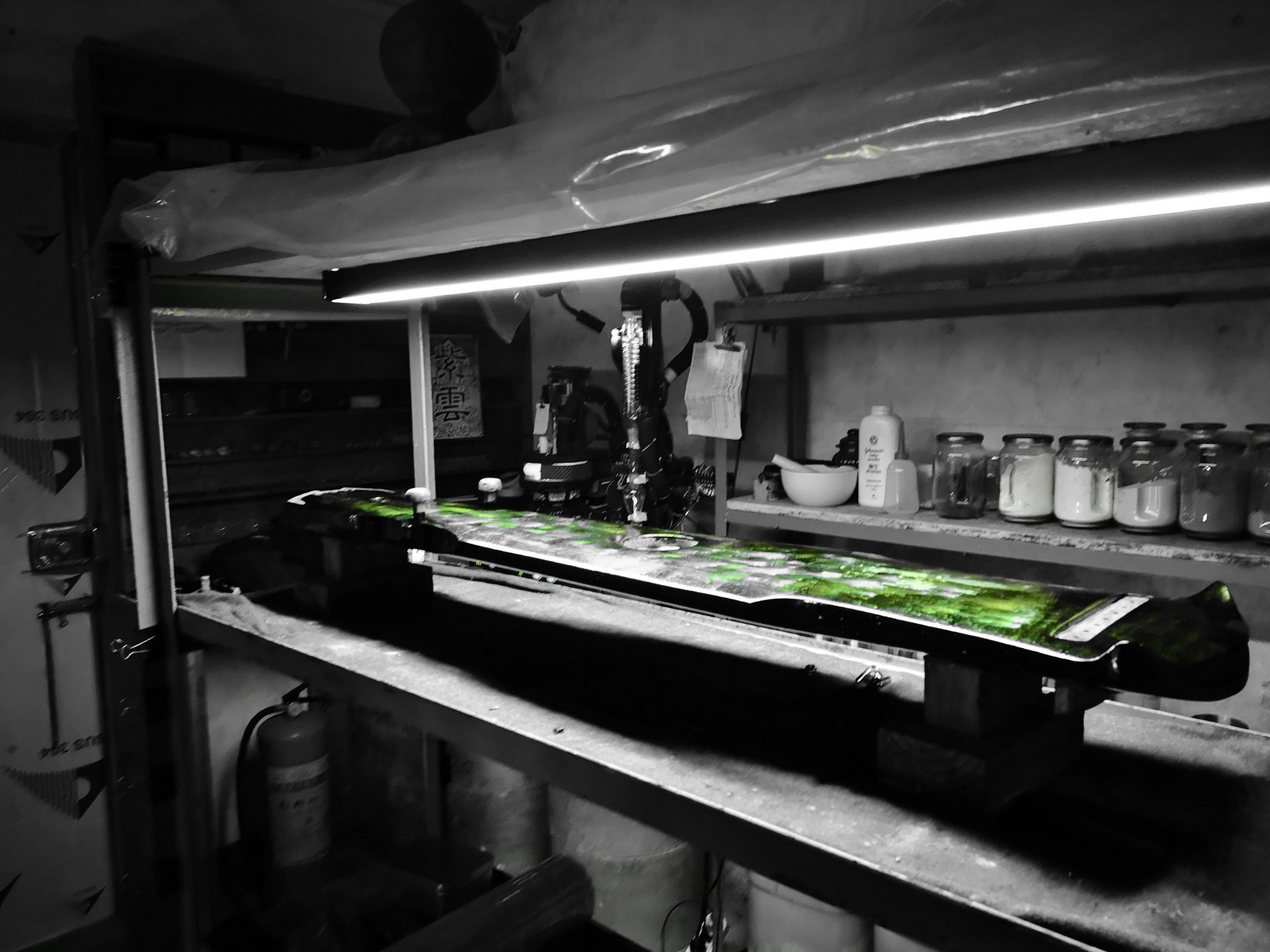 這是另一位琴友的星河琴,目前在做特殊的底面塗層,也算是試驗性製作,所用的是上一張自用琴的“餘料”,也就還較為貴重的真金粉混合物。