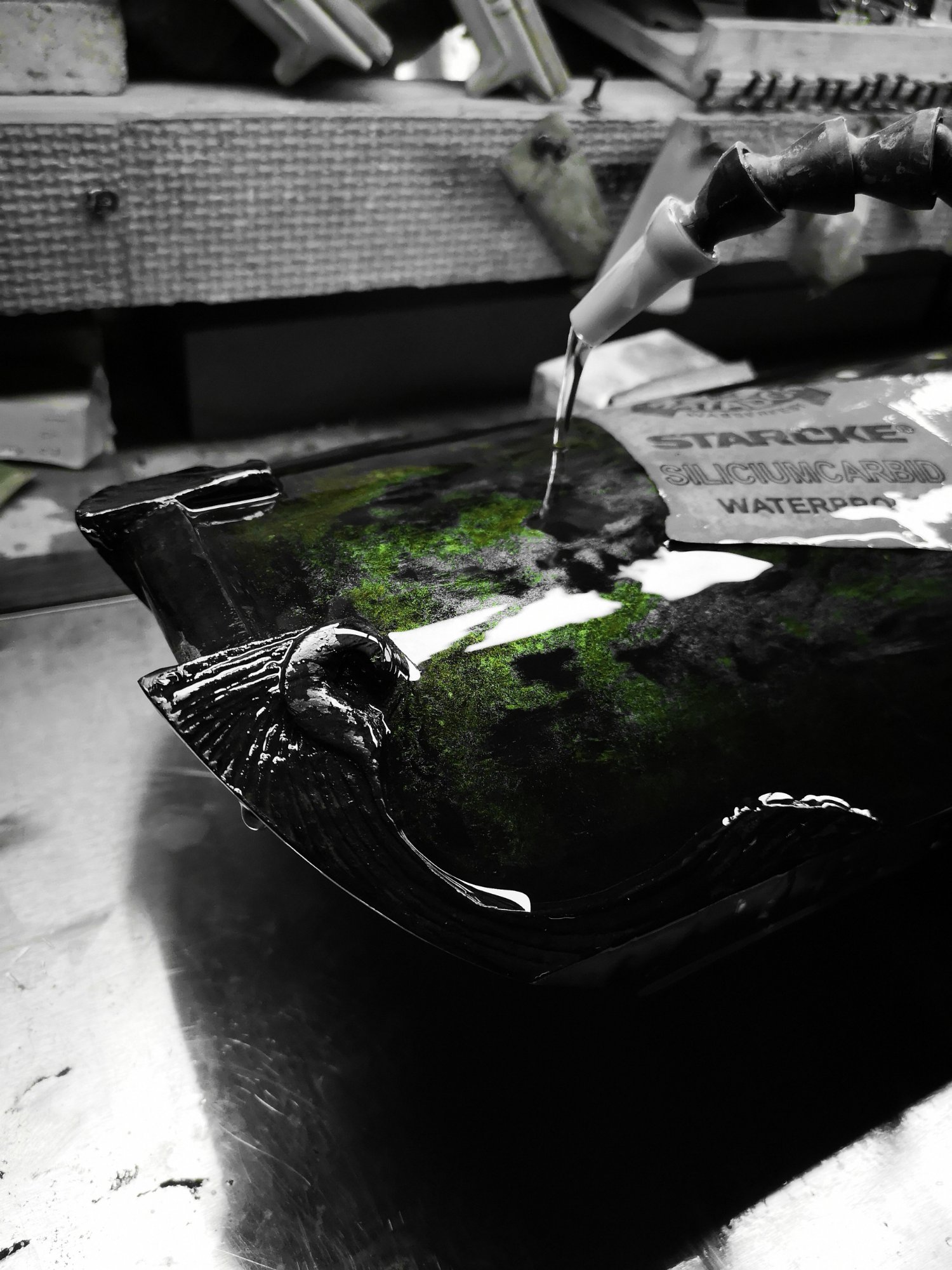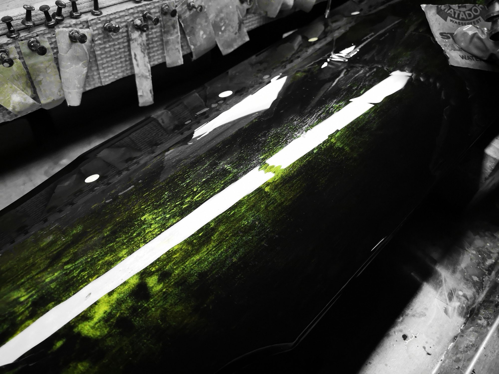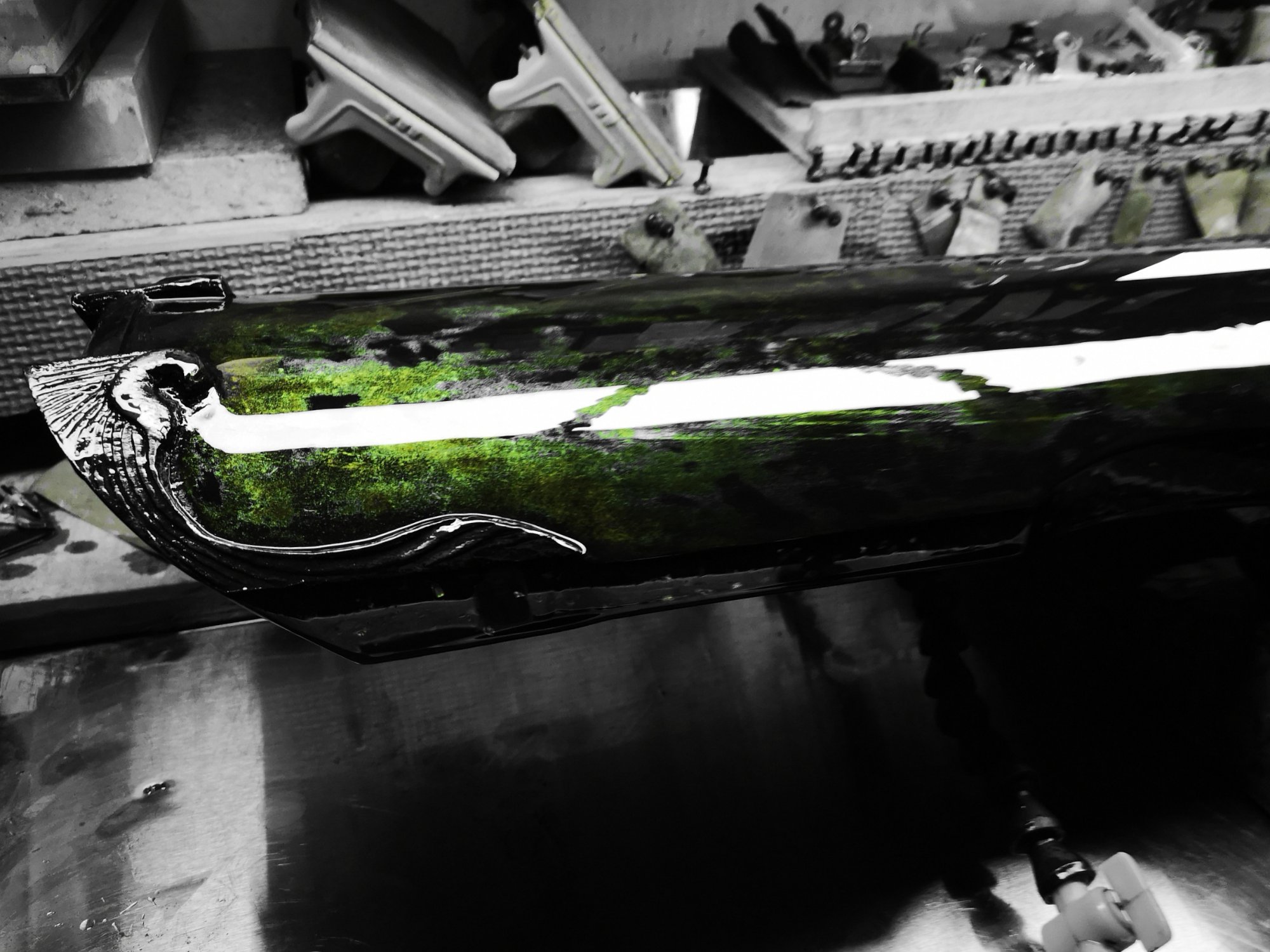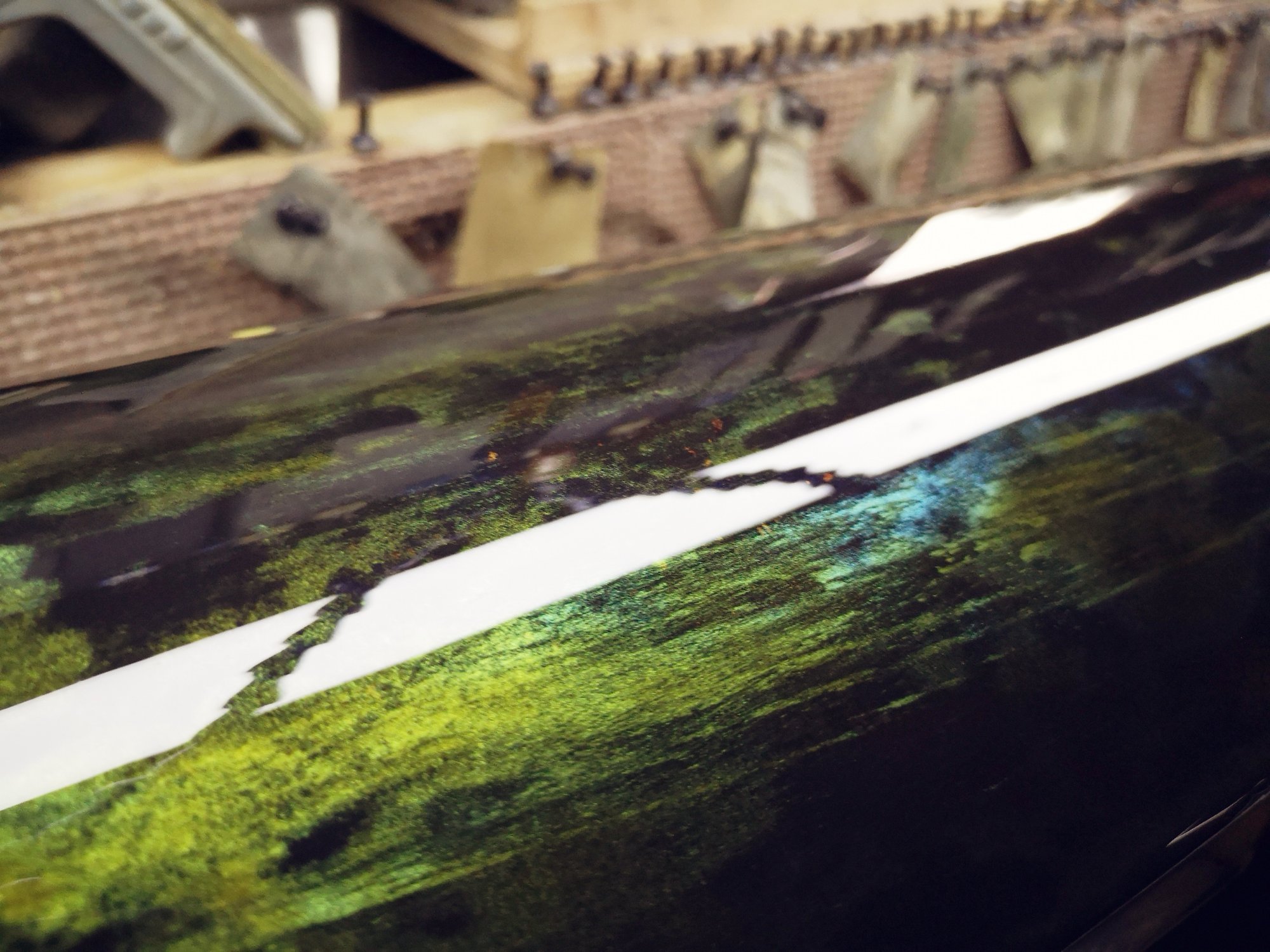 到目前這壹步,整張琴全身漆面使用1500目砂紙進行水磨。因此只能在水濕情況下看到內部透影,也同時有個細節問題在於水濕情況下難以看清打磨遺漏的微小紋理,因此這壹步除了強光照射,也還需要多次擦幹晾幹後進行復查。