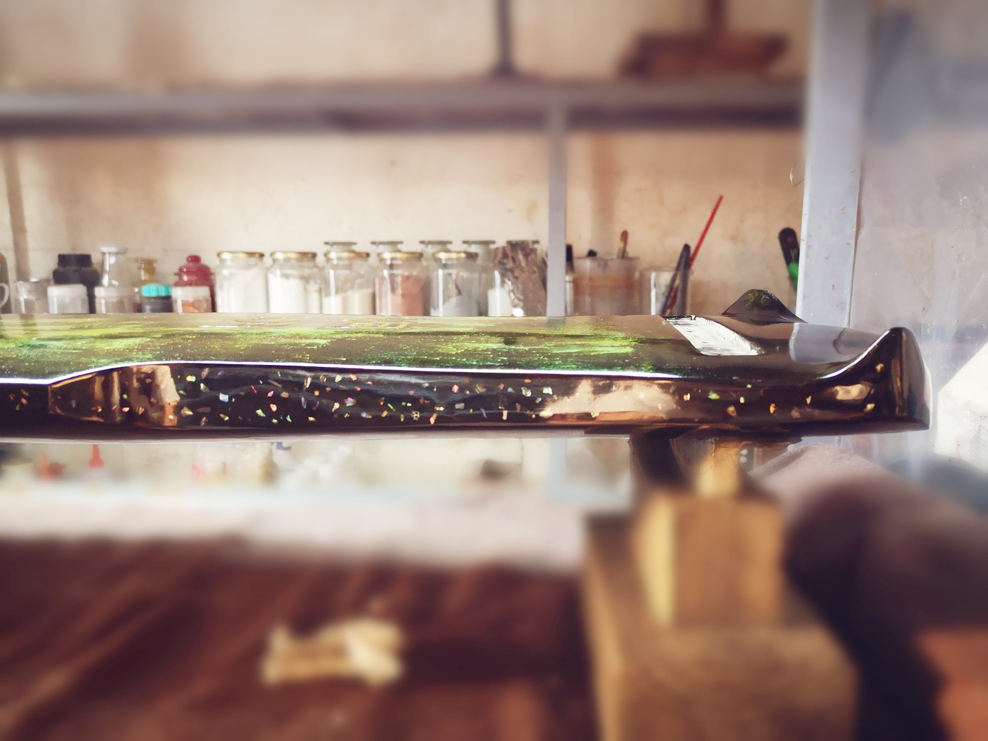 這次就在“玥”琴面上使用最近煉製的透明漆