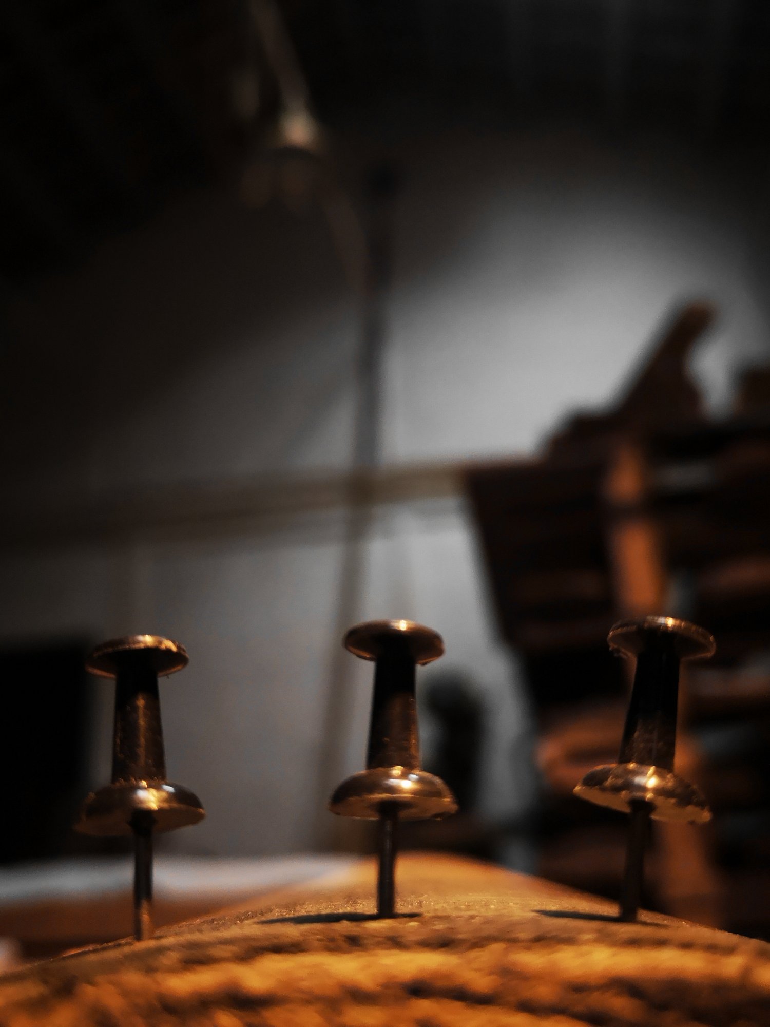 圖釘,在古琴斵製上用途繁多,甚至從一塊木板開始的構圖已經需要用到。