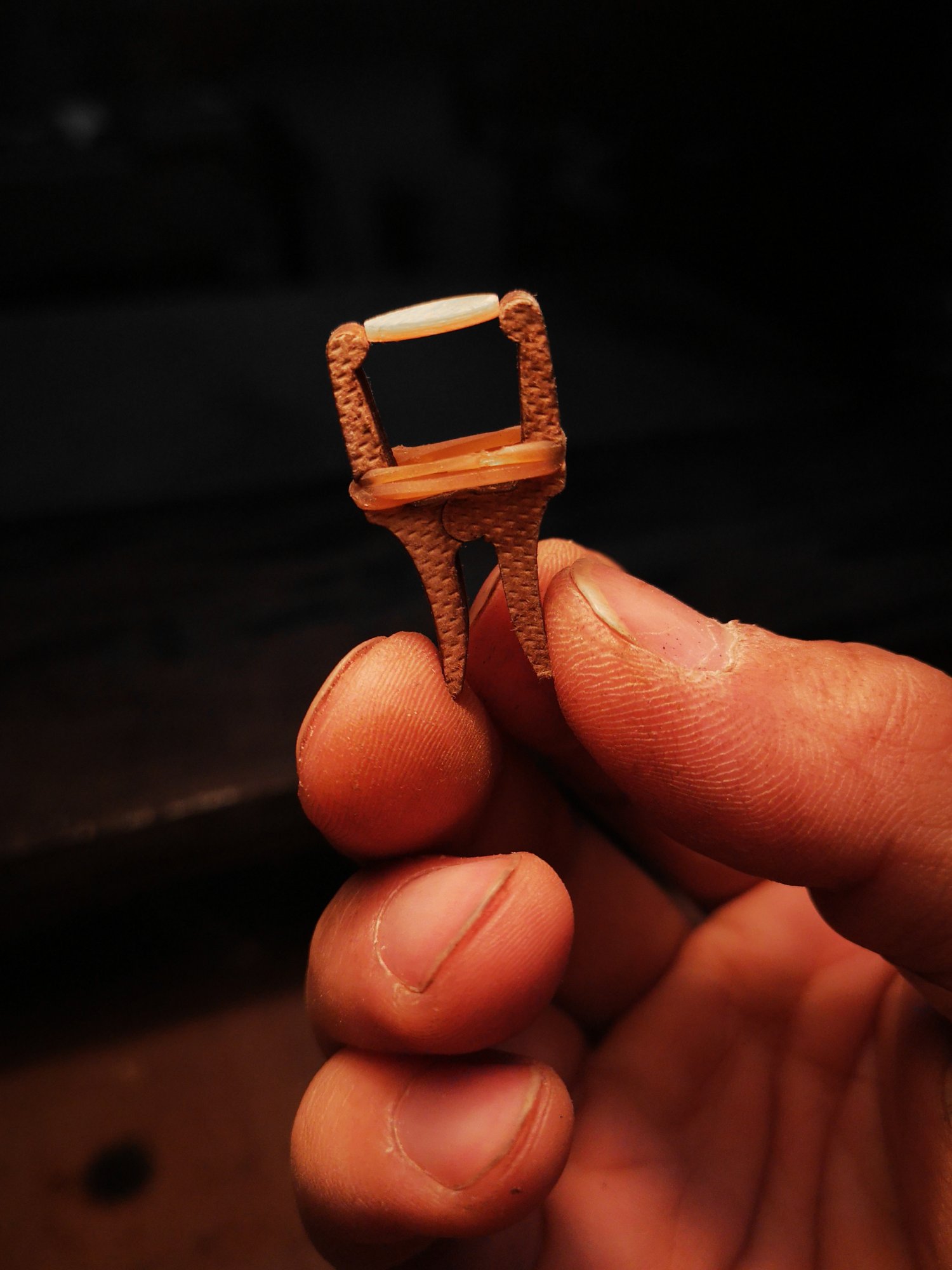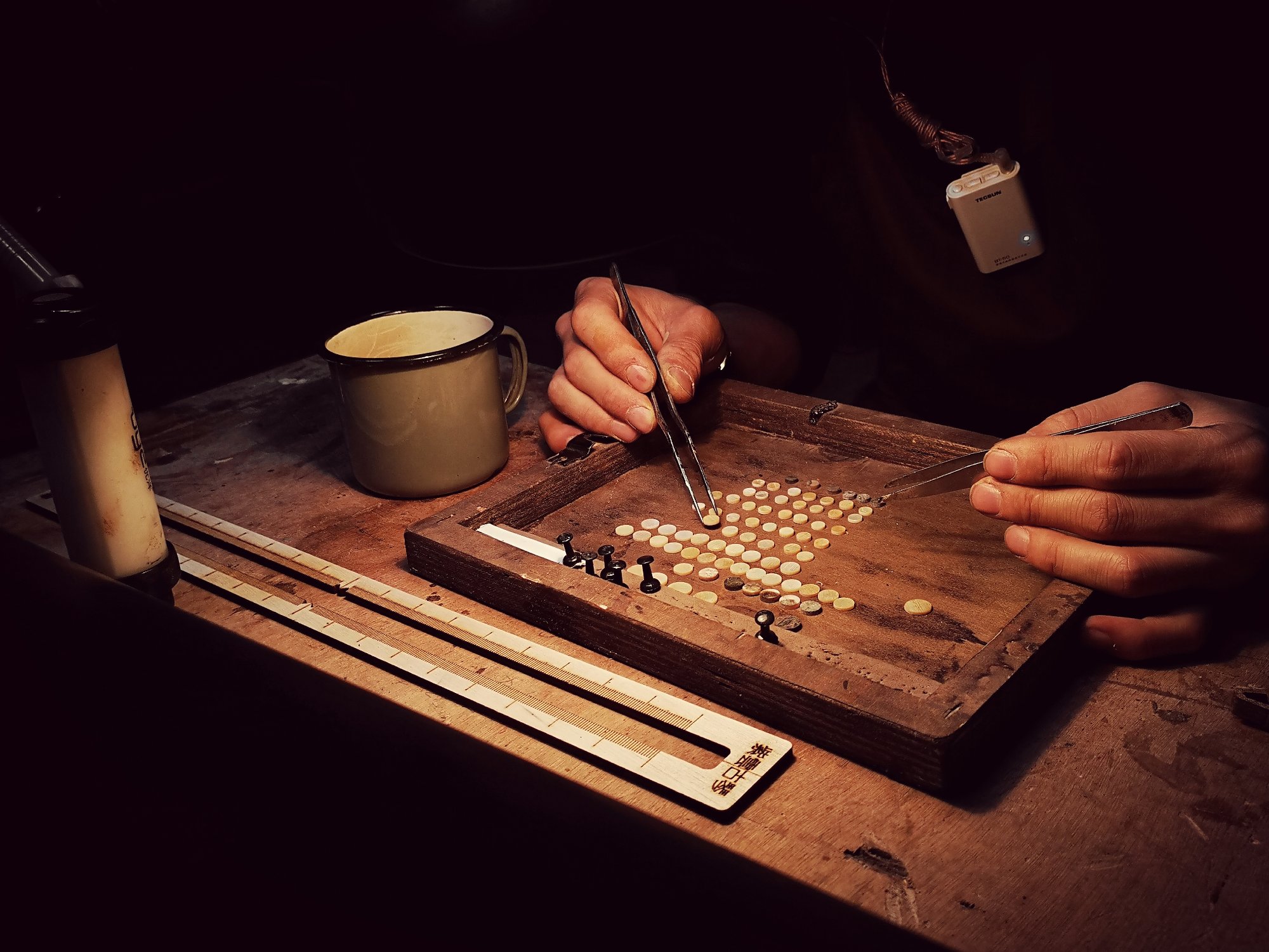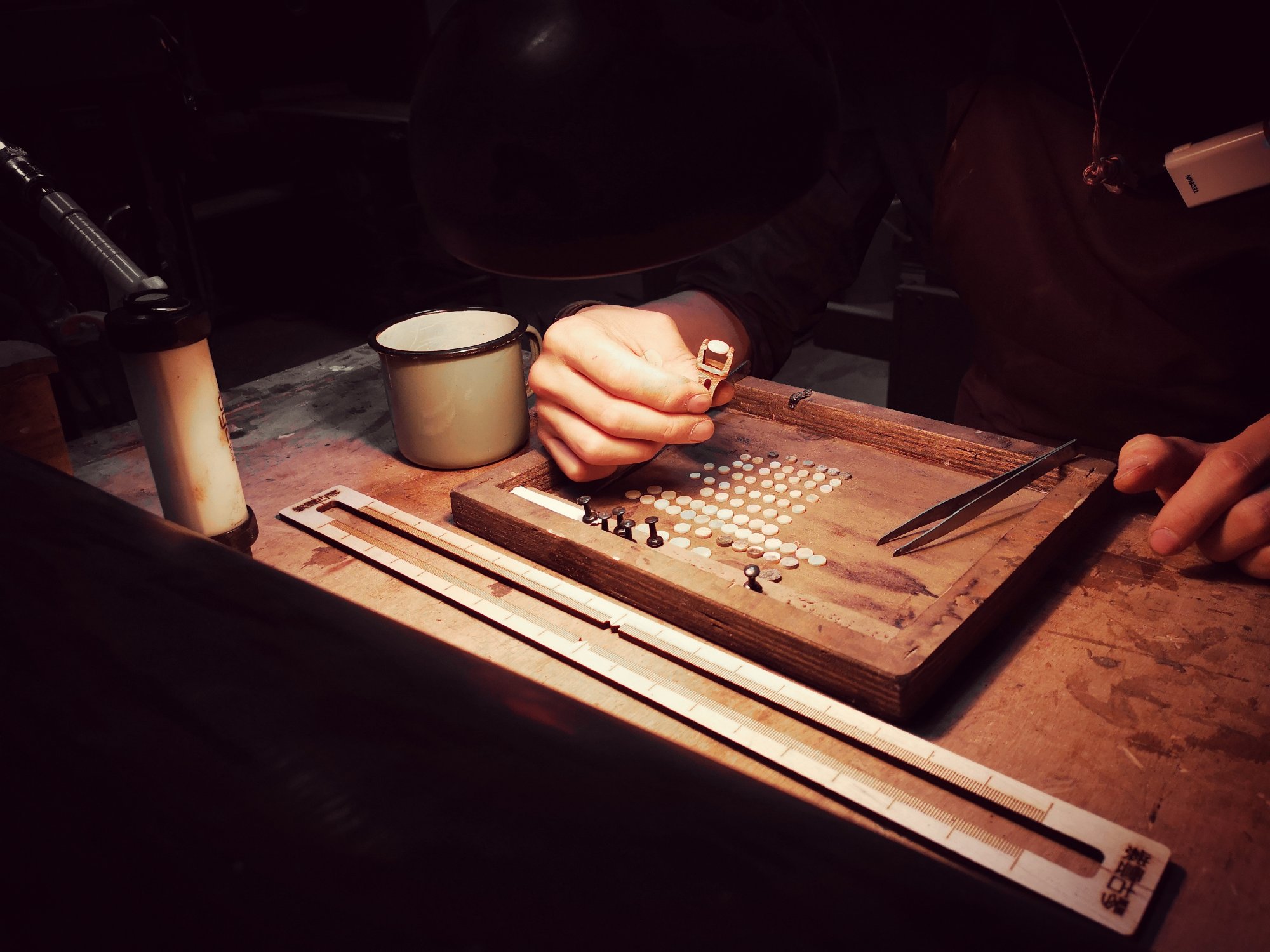 在這一部分工作上,也許親自切割貝殼徽位,定義其更細化的尺寸,更能給予人「自然過渡」的視覺感受。