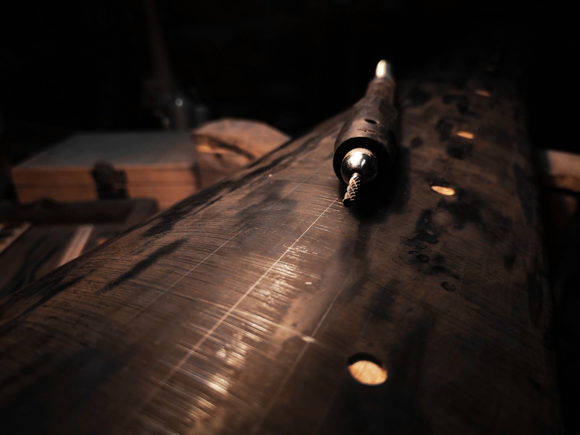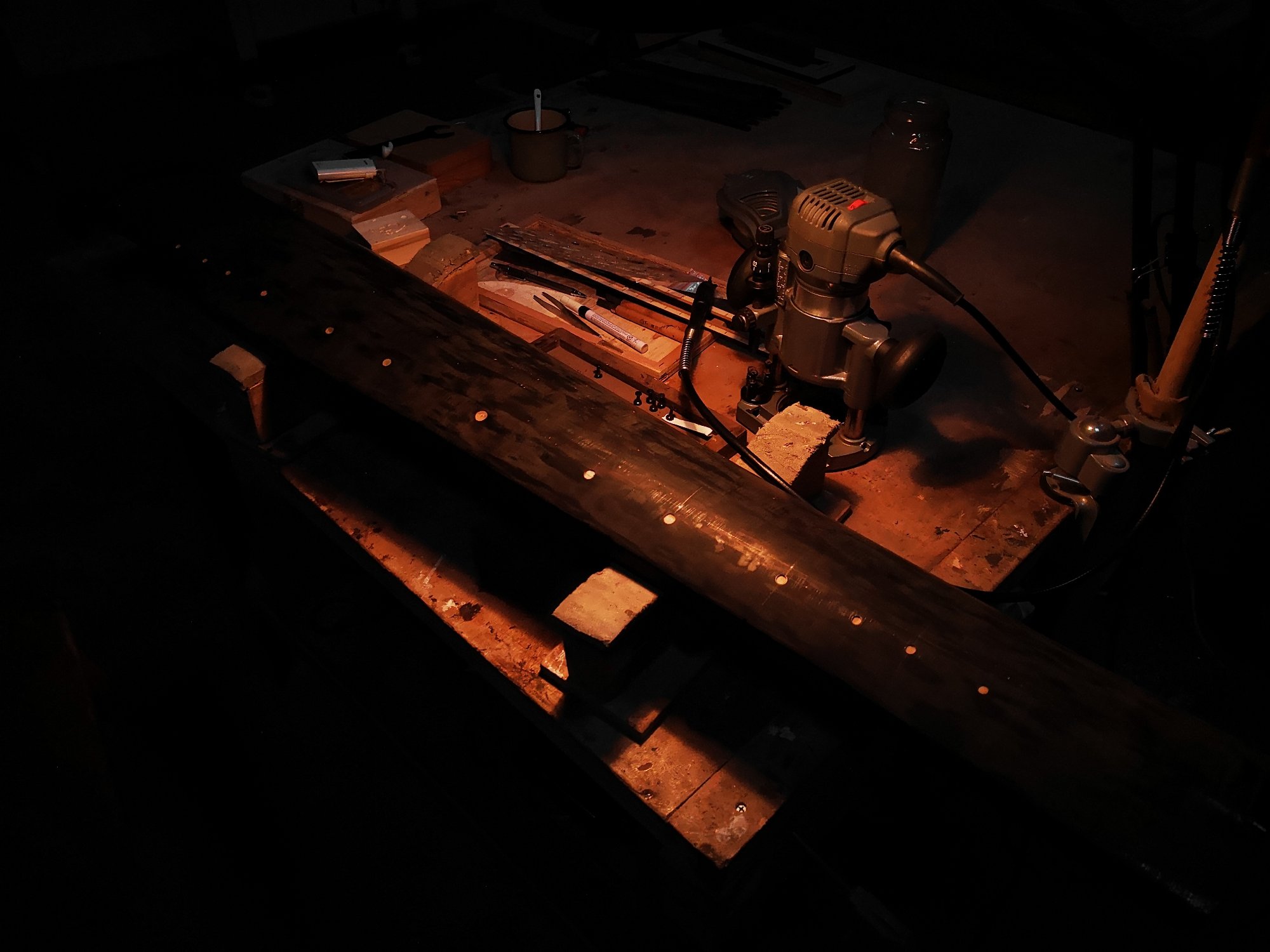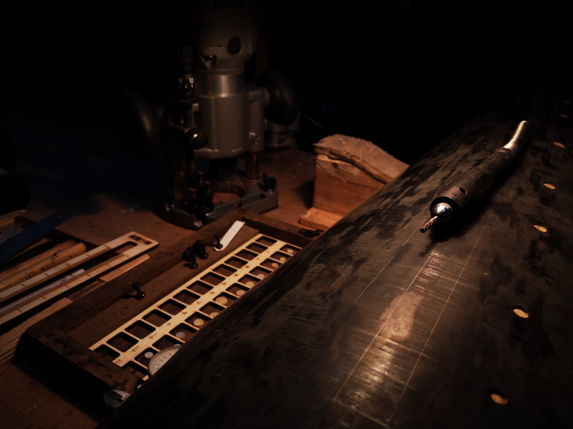 目前總結最優解就是先使用「雕刻機定高夾具」,準確且慢速「下沉1mm」,這一步需要預先使用「卡尺」測量與檢查所有貝殼徽的「最少厚度」。藉此決定預先下沉深度,使貝殼徽鑲嵌後,高出琴面灰胎「一張紙厚度」。