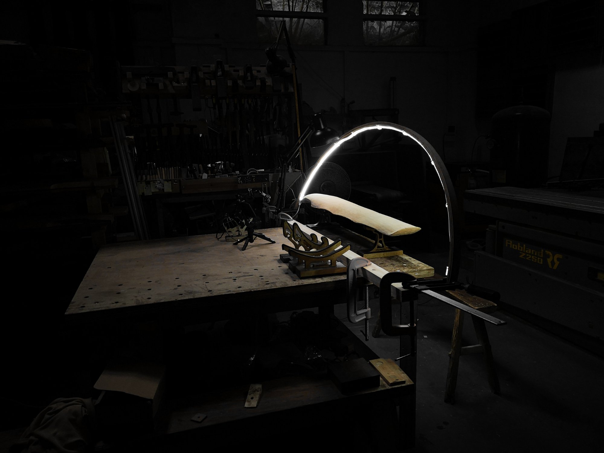 正因為在「扁平狀態」下,我們可以更輕易地分析與檢查琴身每一部位的「實線」交接。
