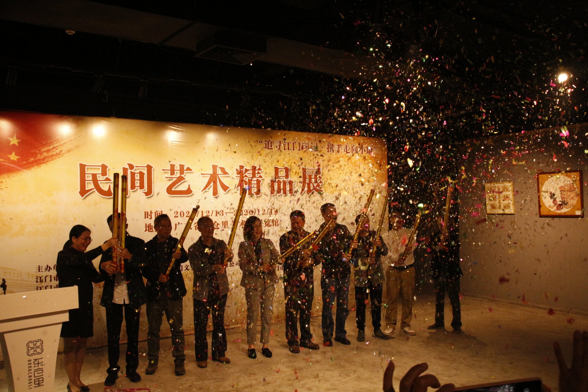 隨後,一眾領導上台鳴放禮炮,宣布《追尋江門印記、攜手走向小康——民間藝術精品展》正式開幕。
