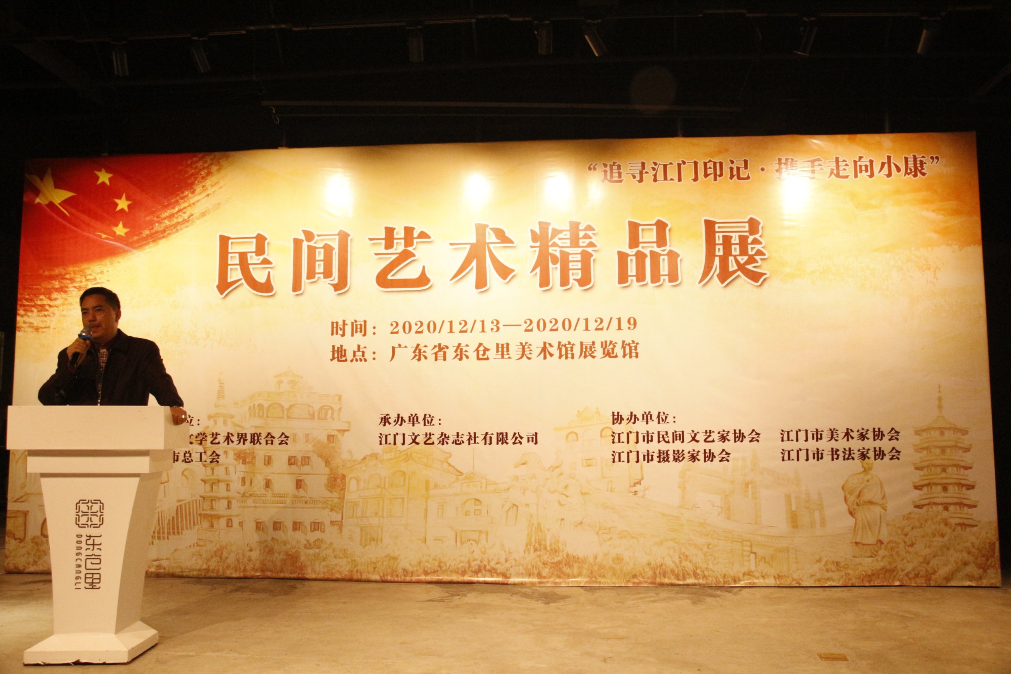 在開幕式上,江門市民間文藝家協會主席張瑞亨先生介紹《追尋江門印記、攜手走向小康——民間藝術精品展》籌備情況以及江門五邑民間文藝近年創作發展情況。