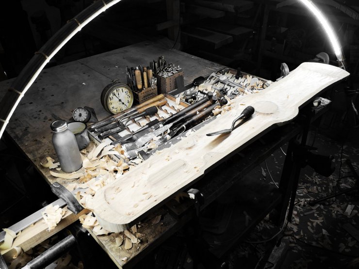 在底板的開孔和麵板的構圖完成後,就可以進行初步挖槽腹處理,讓面板進一步因應自然乾縮而產生定量誤差,並為下一步的安裝配件工期提供更穩定的基準面。