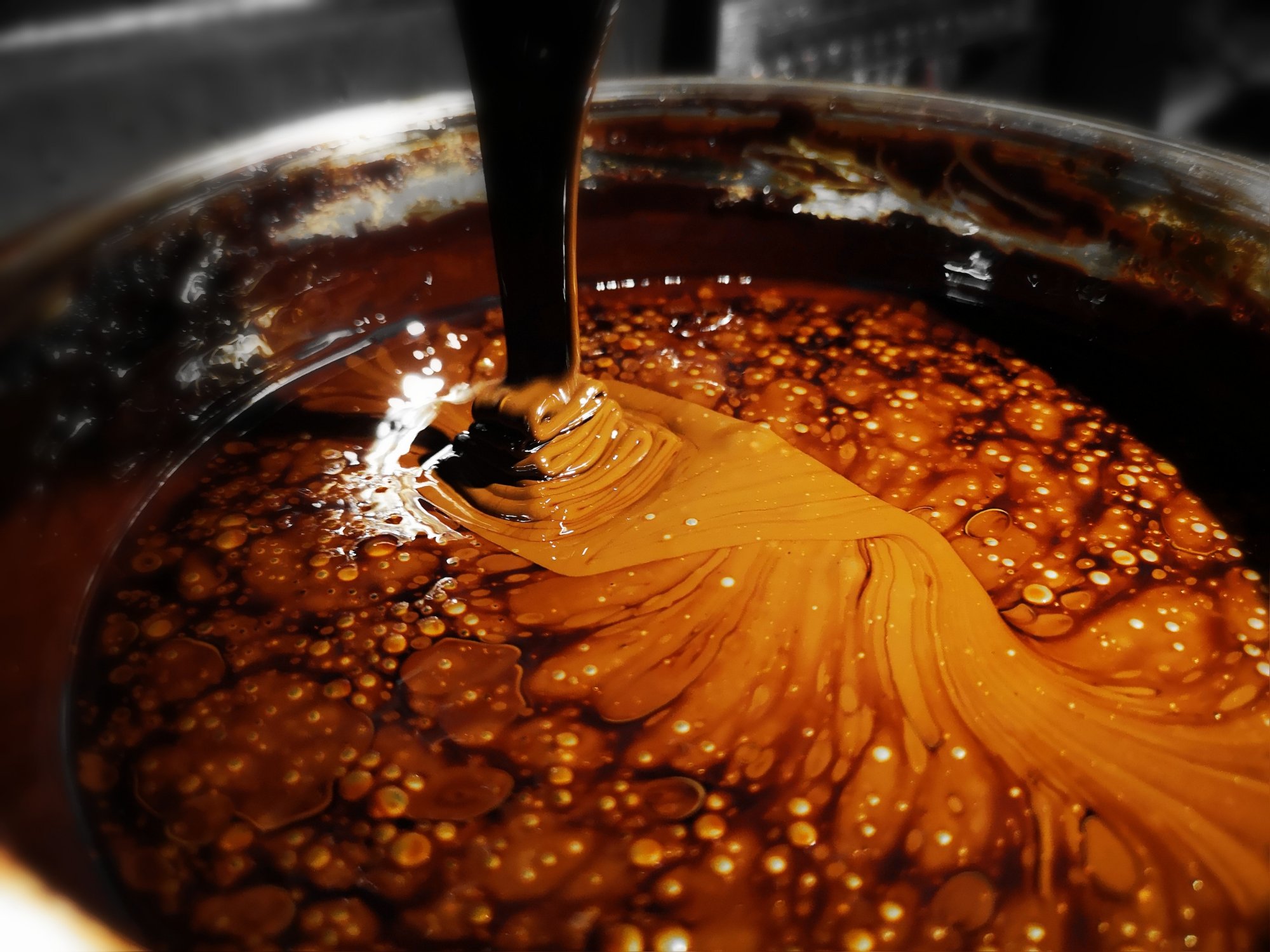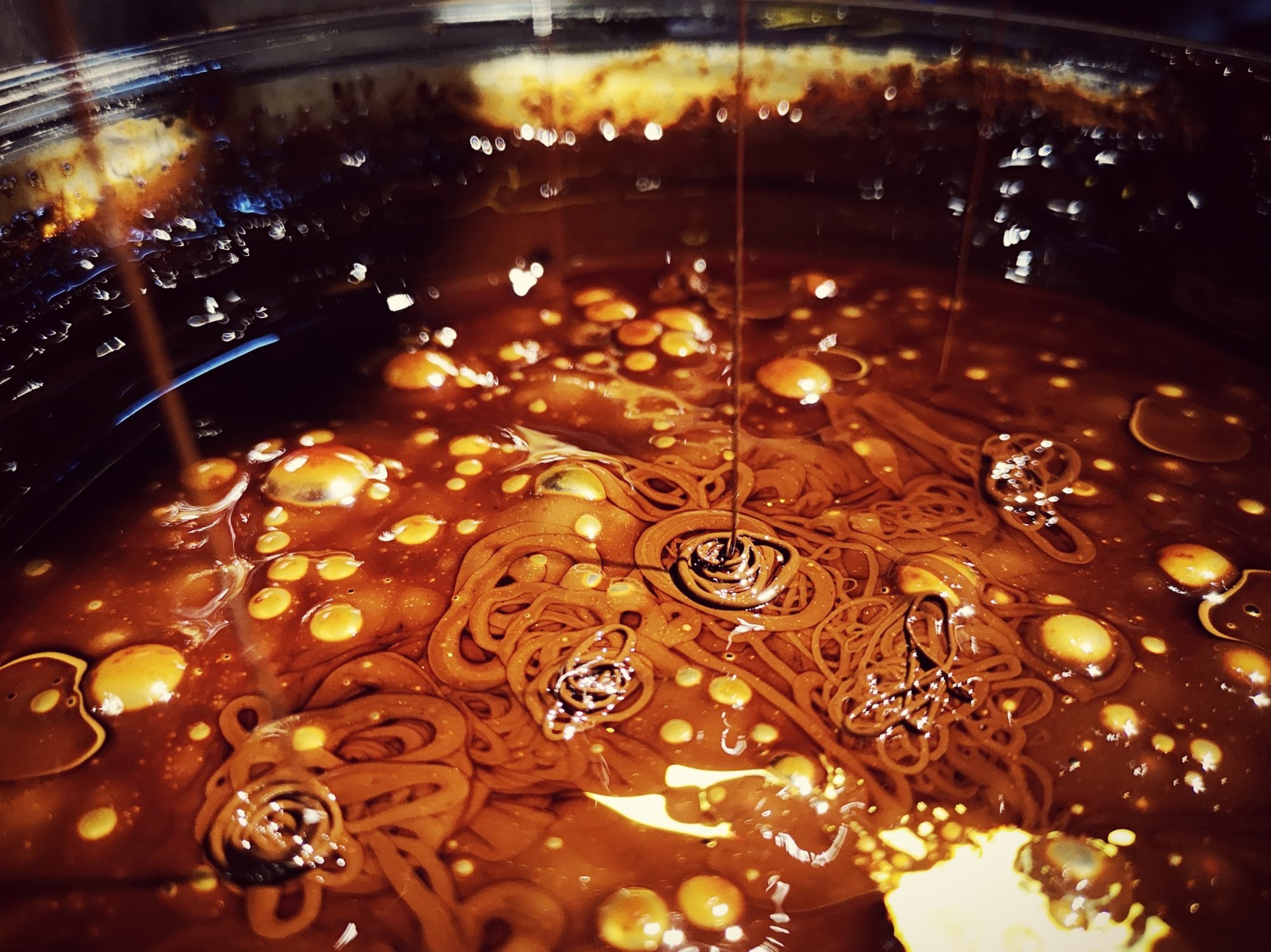 經過長期攪拌煉製的“透明漆”半成品,而其已經可以“疉絲”。