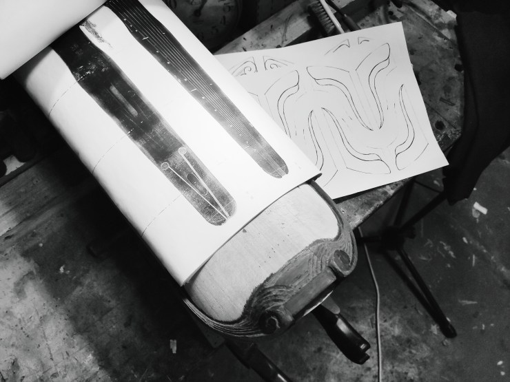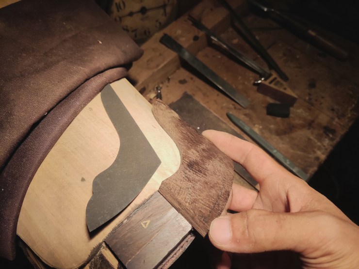 正如上一階段規劃,由於冠角鑲嵌定位在琴尾並緊貼龍齦,所以對古琴音色與視覺皆占有相當比重。穿插在古琴造型、調音、鑲嵌、裹布、刮灰、雕刻過程中的冠角鑲嵌就需要留有足夠的調整幅度。