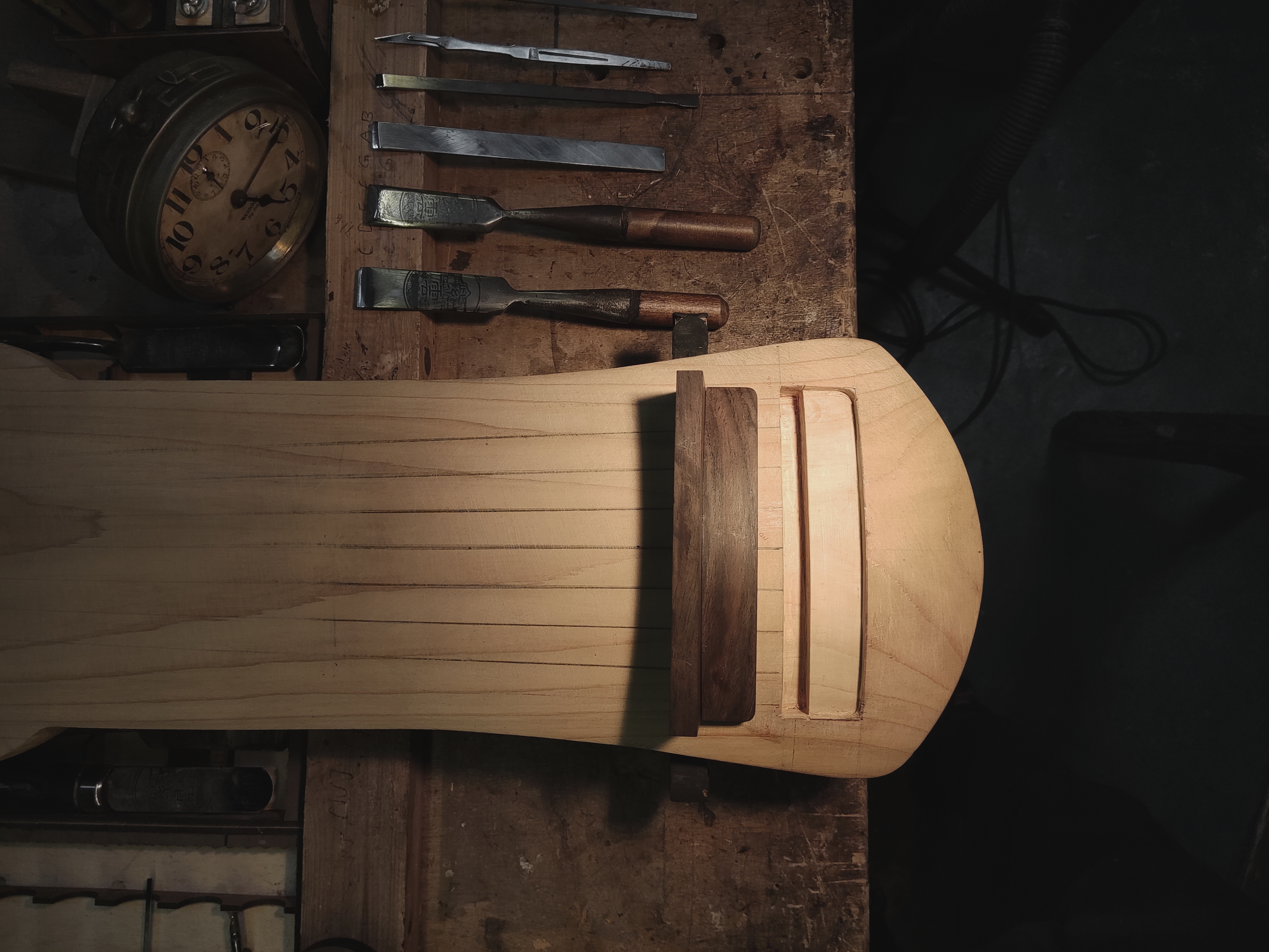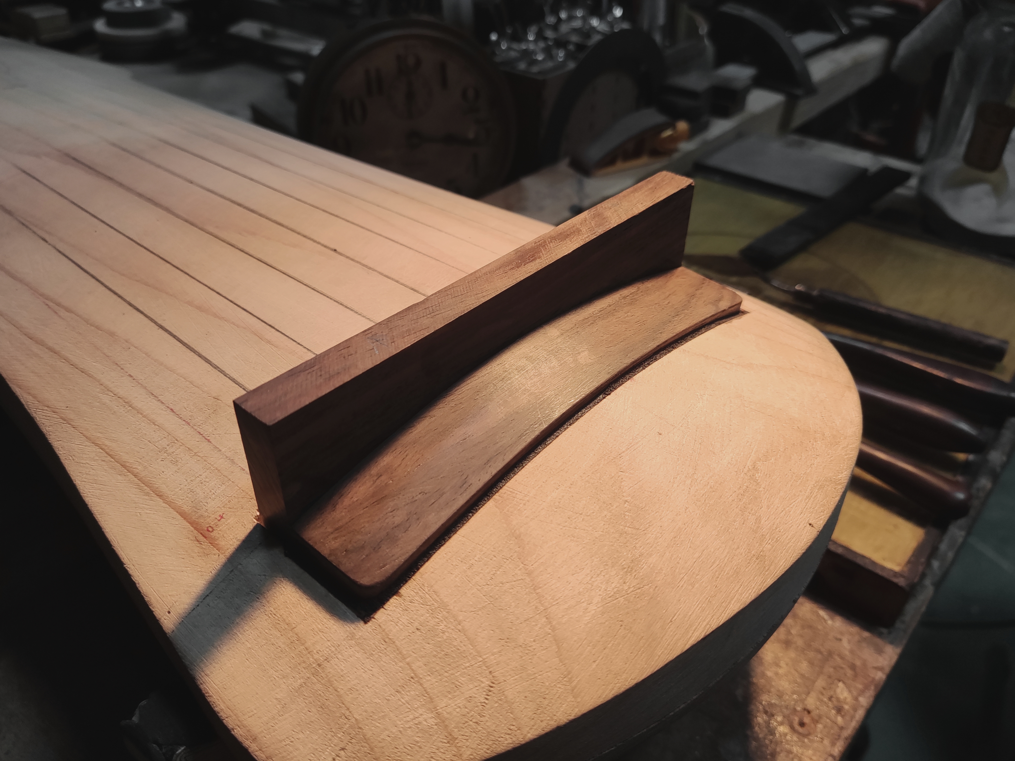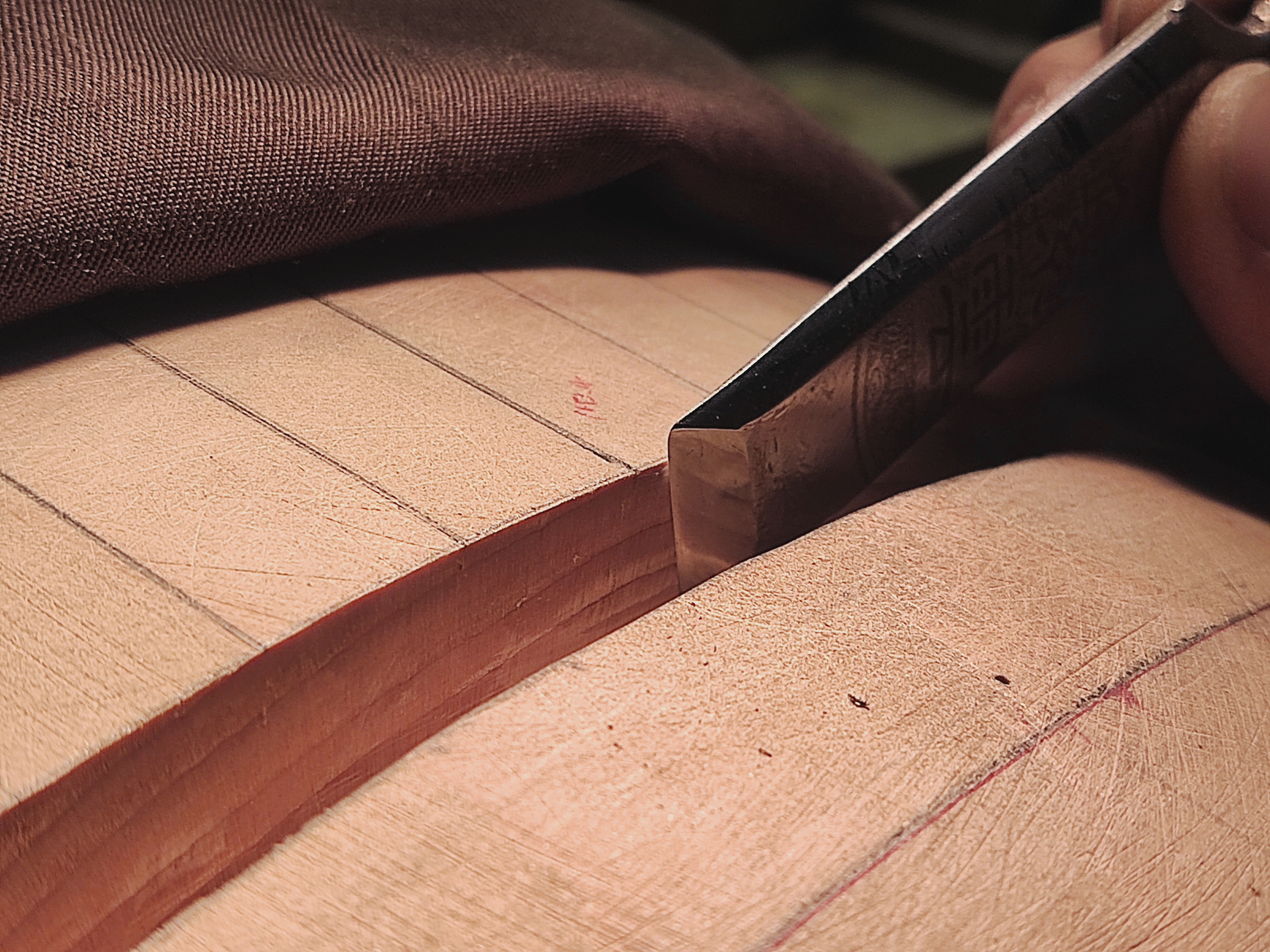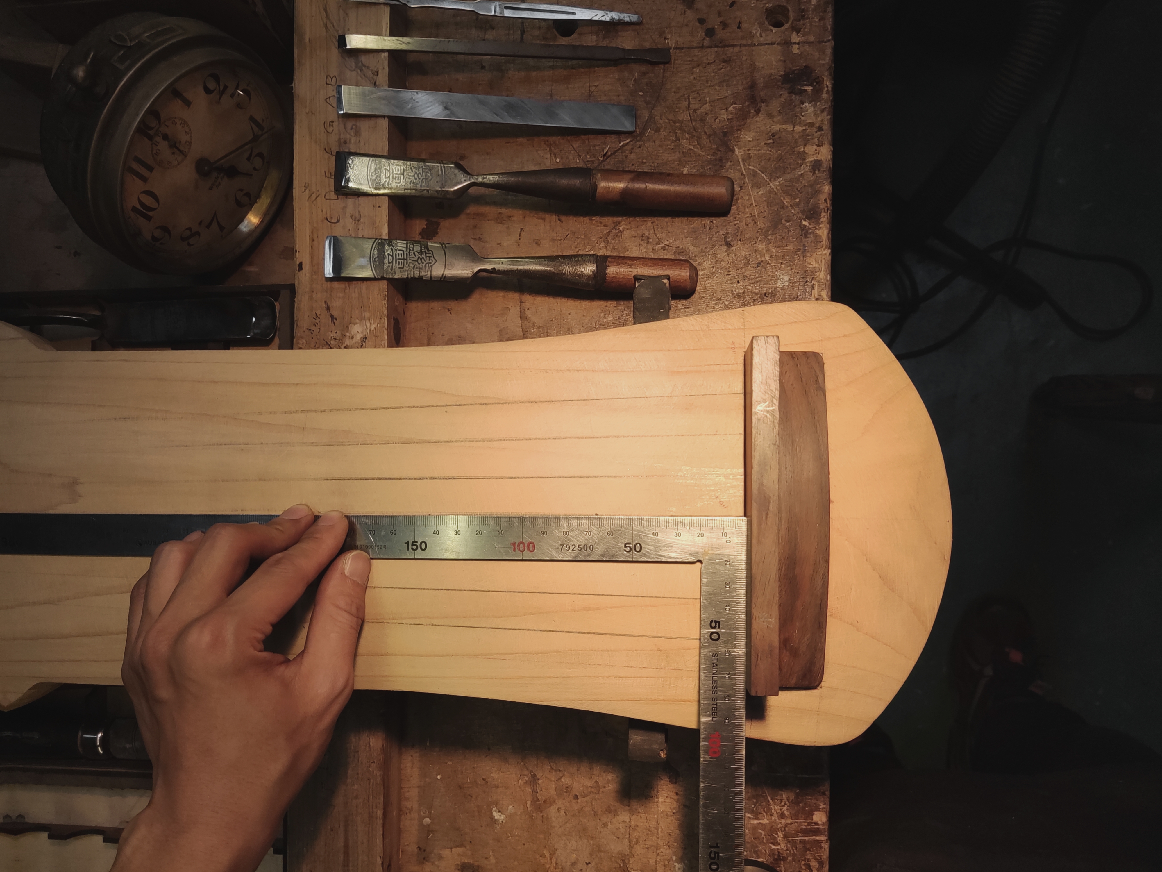 所以爲了盡可能減少收縮縫隙對音色帶來的不同影響,其鑲嵌工藝就需要做到兼顧時間推移所帶來的前因後果。既要穩定不同季候變化所產生的縫隙與張力釋放方向,更要保持其承載琴弦拉力強度。簡而言之;歲月推移其滄桑自然而然,其生命張力依舊蒼勁。
