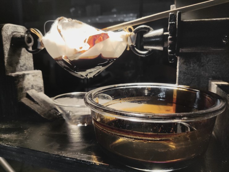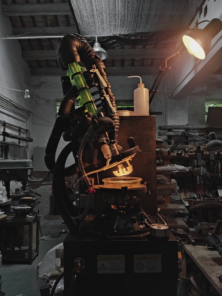 就是將天然漆保持在其蛋白質結構和活性的溫度臨界點下,通過物理手段將漆中的水分進行無氧蒸餾,隨後再緩慢將其進行正常氧化到所需的色澤,並且再進一步降低其中含水量。