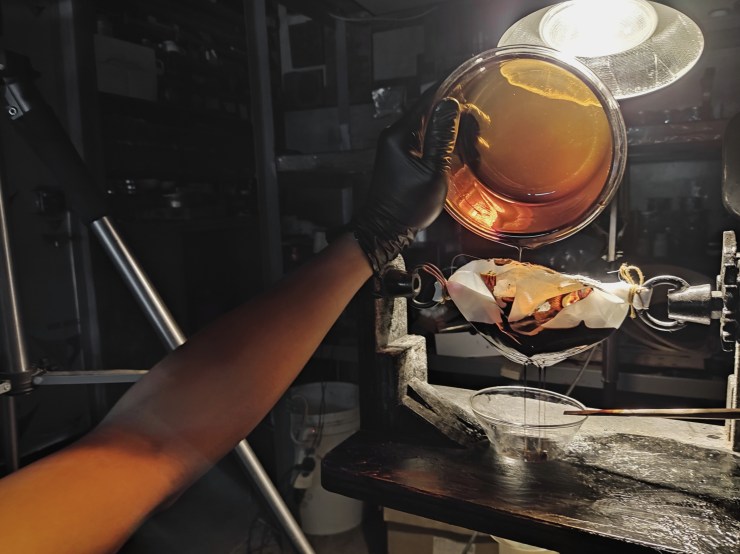 至於另一種做法則迎合工業化以及量產需要,進行大瓦數日光燈照射與24小時的機械攪拌。也更有一種來自東洋的黑漆做法是直接加入棉花進行高溫捶舂形式進行熬煮,隨後趁熱進入離心機分離並過濾。