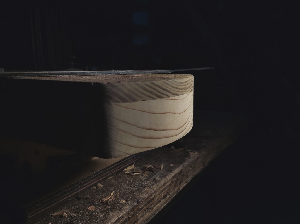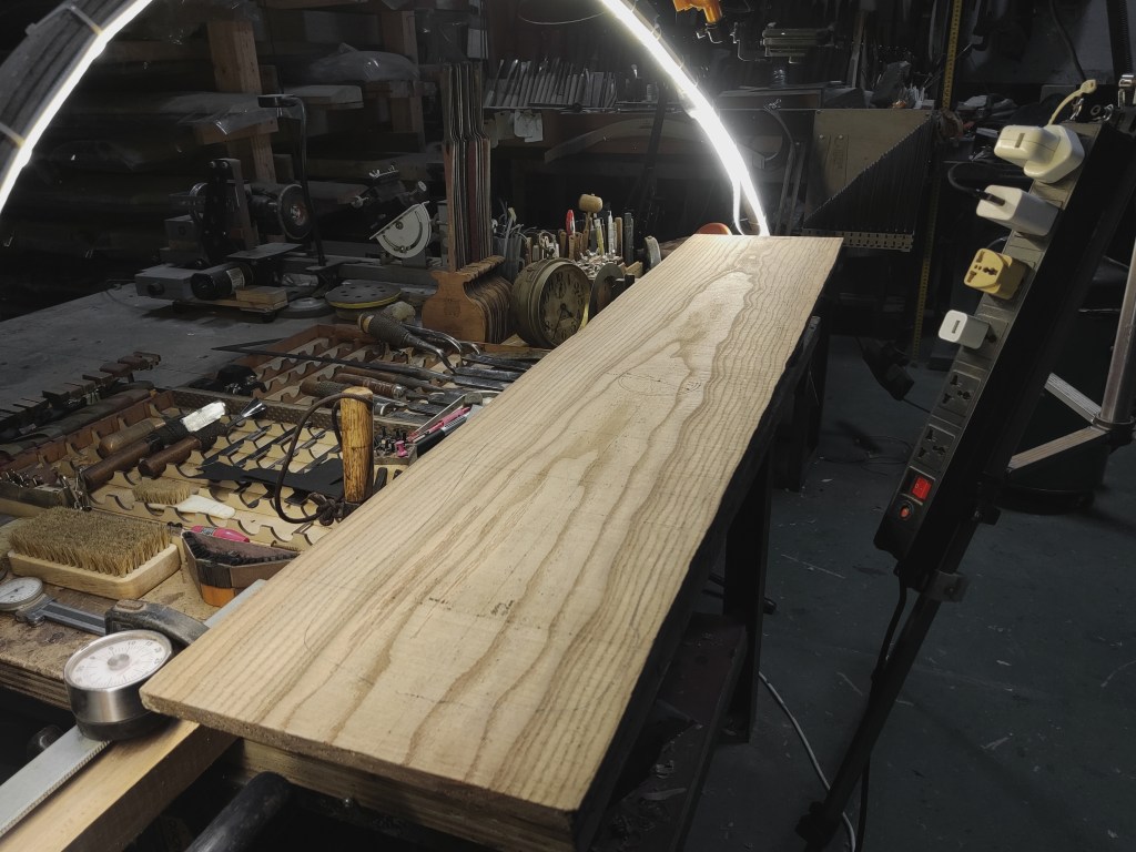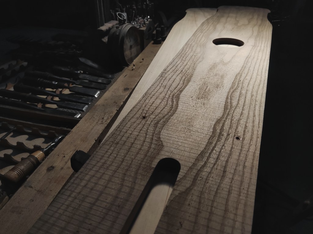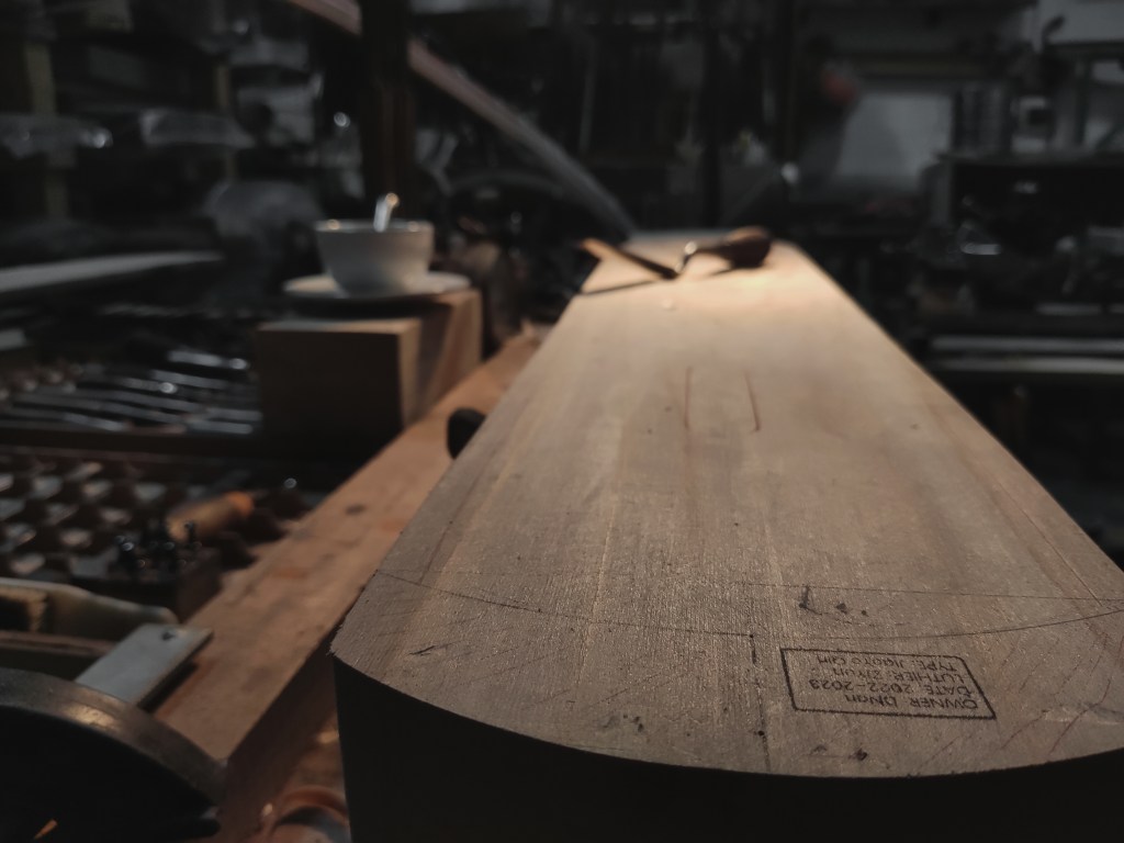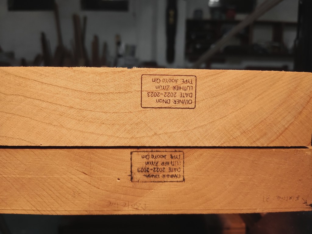 “木直中繩,輮以為輪,其曲中規…-《勸學篇》”。雖料無完料,但仍可在樹木成材後進行適宜的裁切從而取得最佳的使用範圍,尤其側重於避開蟲眼、結節、裂縫等。在木材切割後儘量取其軸心對稱,為跟著下來的琴體構圖以及內部結構佈局提供最佳的設計範圍。