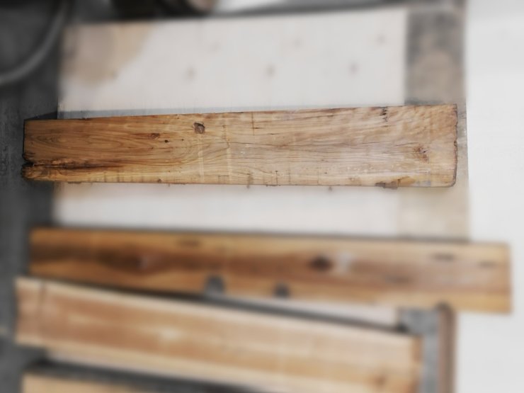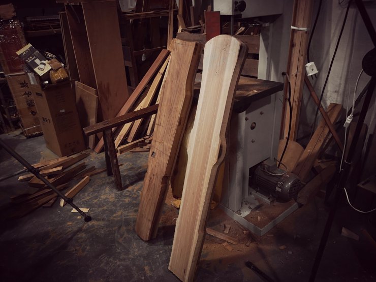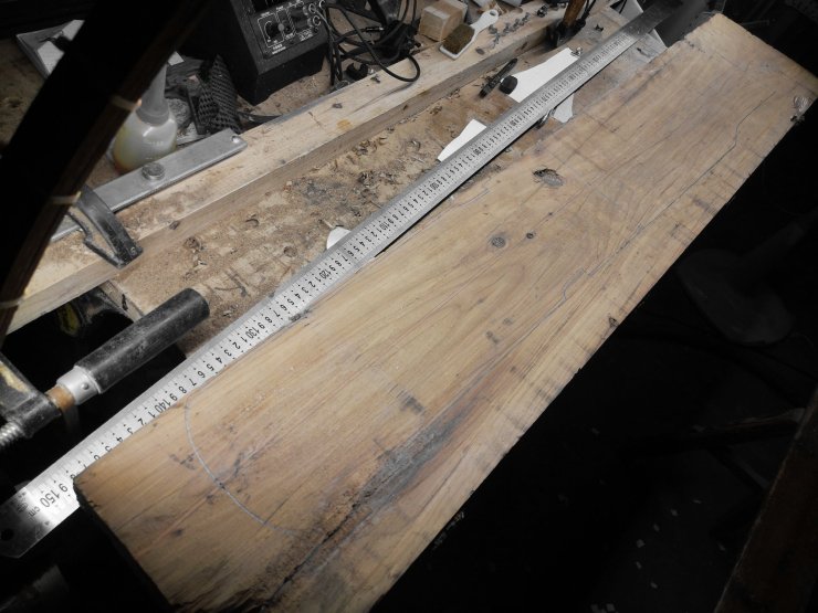 在四處尋覓木材的時候收集回來的一部分難以用以斲琴的殘缺料,而這塊料一直由於在尾端有巨大裂縫而擱置有一段時間,而直到如今才發現這次的琴身恰好足夠寬度避開此裂縫,而只需要在琴頭修補一小塊殘缺。