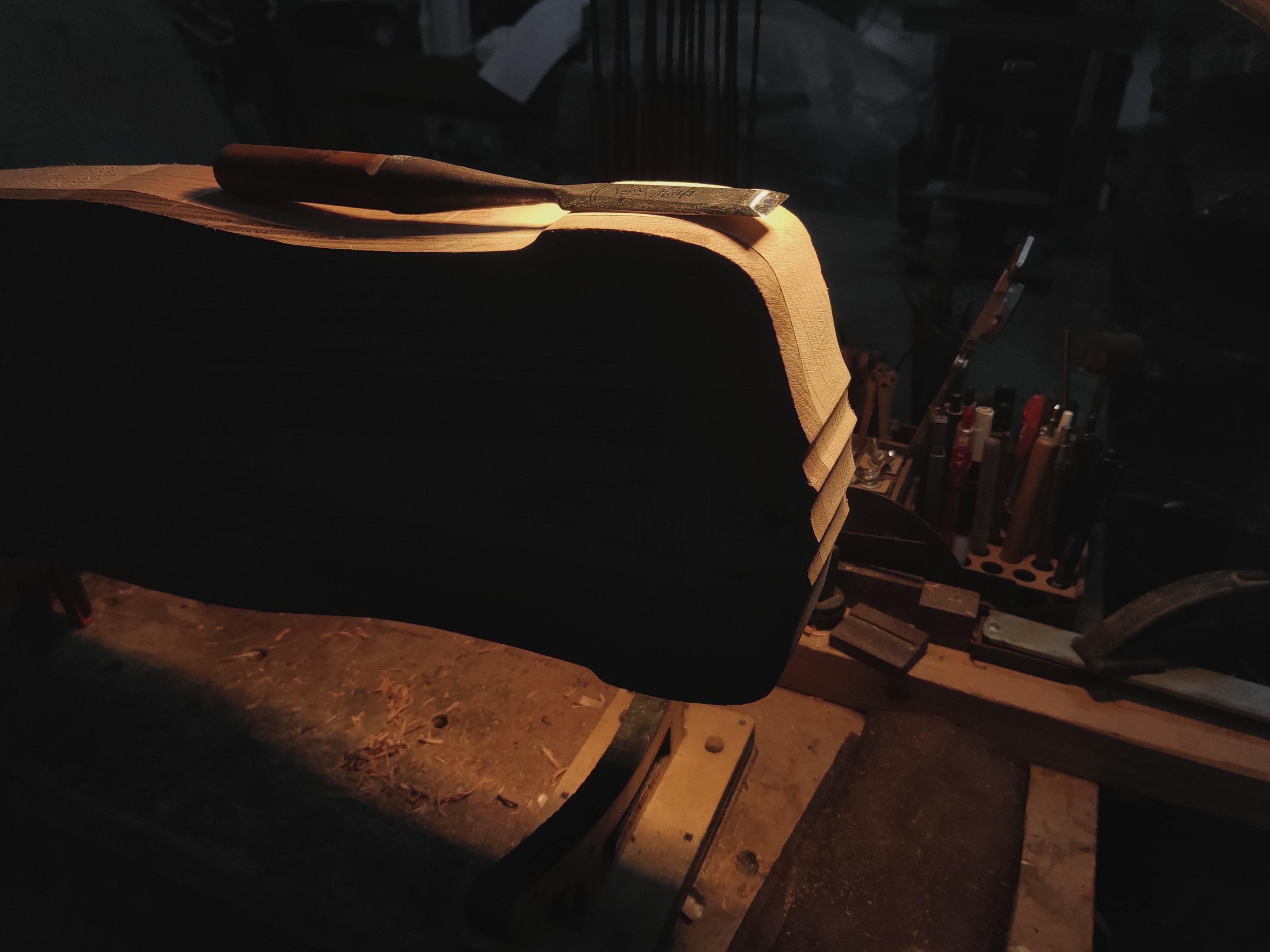 Usually, a small wooden mallet is used for tap-scanning, during the woods matching and cutting, and the tapping-sound is used for rapid diagnose various sections and deep layers, so as to avoid the potential cracks in the cutting materials. And at the same time, Cross-comparison of soundboards that match each other in the multi combination.